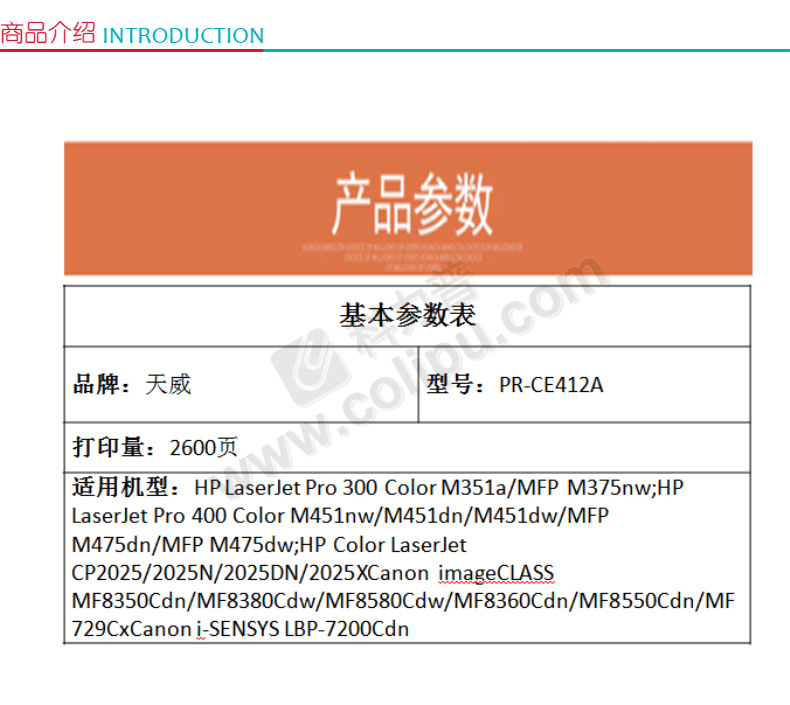 产地:广东珠海;打印量:2600页;适用机型:HP LaserJet Pro 300 Color M351a/MFP M375nw;HP LaserJet Pro 400 Color M451nw/M451dn/M451dw/MFP M475dn/MFP M475dw;HP Color LaserJet CP2025/2025N/2025DN/2025XCanon imageCLASS MF8350Cdn/MF8380Cdw/MF8580Cdw/MF8360Cdn/MF8550Cdn/MF729CxCanon i-SENSYS LBP-7200Cdn;品牌:天威;型号:HP-CC532A/CE412A;颜色:黄色;规格:;内包装:;包装清单:热熔装订机*1台;