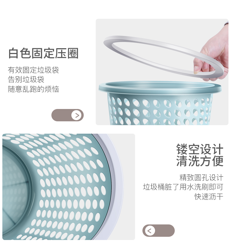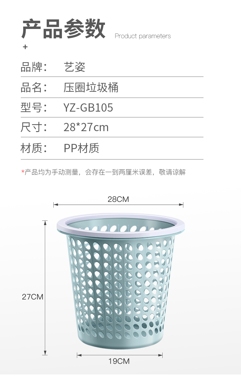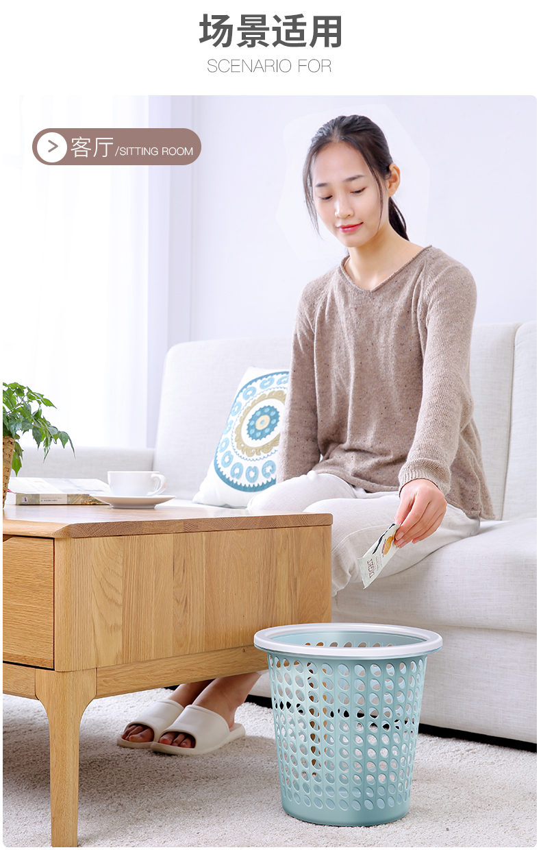 开盖方式:无盖,其它;容量:9-12L;形状:圆形桶,梯形桶;适用场景:客厅,厨房,卫浴,户外,办公室,卧室,餐饮,酒店,物业楼宇,其他;材质:塑料;容量:12L;内桶长宽高:27cm*28cm;外桶长宽高:27cm*28cm;包装清单:垃圾筒*1;