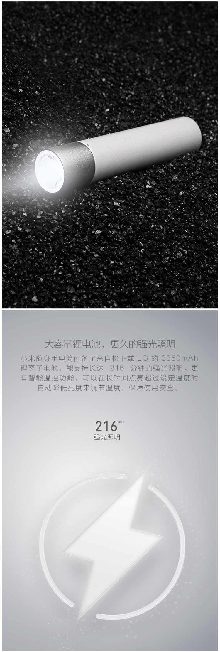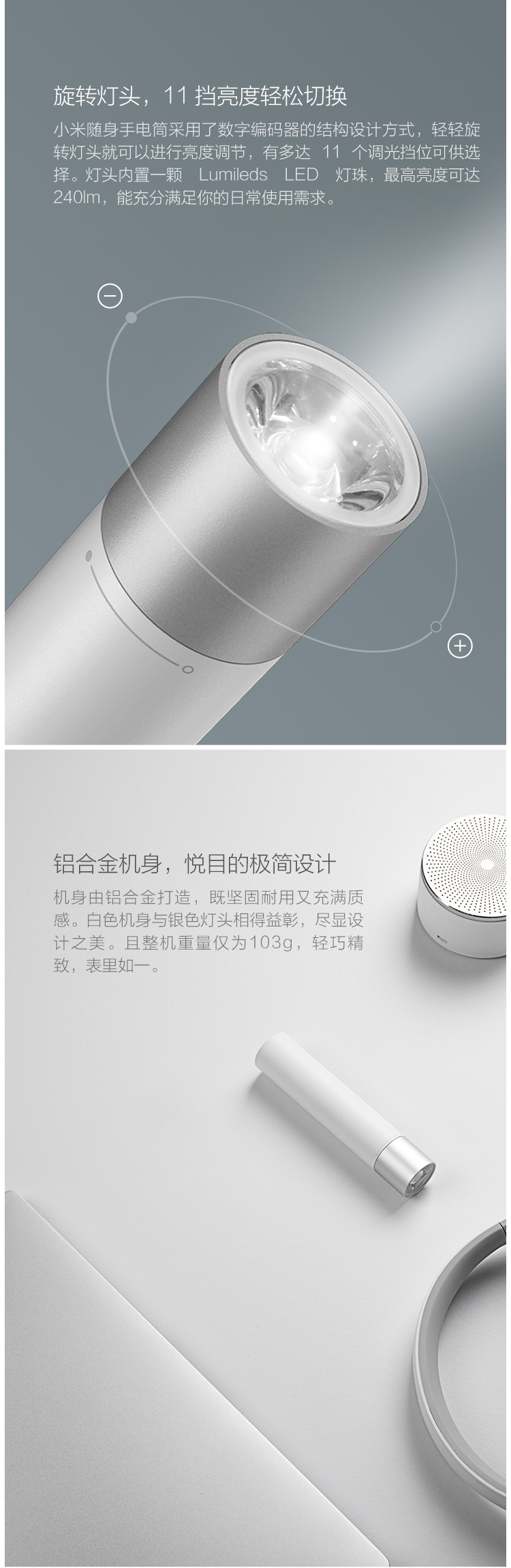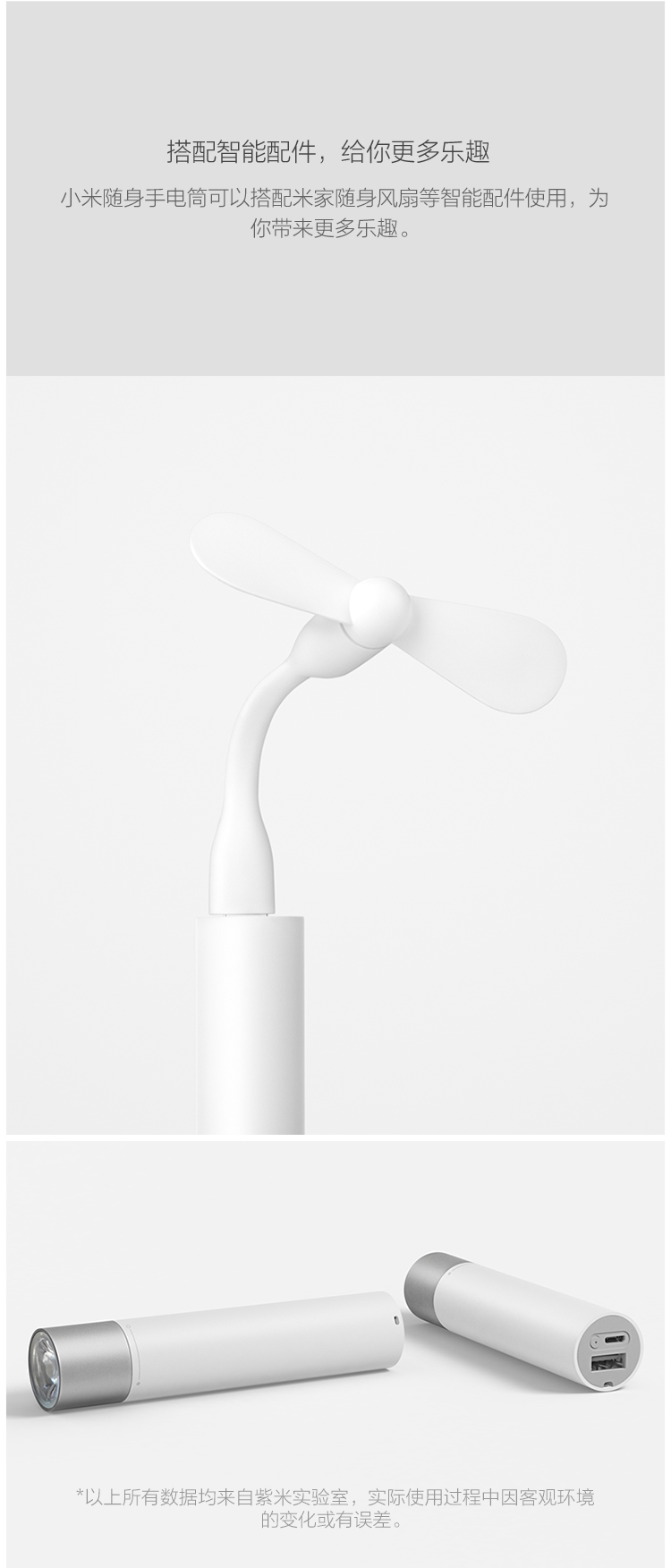 电芯类型:锂离子电池;功能:轻薄便携;容量:5000毫安时以下;外壳材质:合金;双向快充 不仅支持快速输出,也支持快速输入:不支持双向快充;USB接口数:单口;苹果输入 支持苹果接口为移动电源充电:不支持苹果输入;TYPE-C输入 支持TYPE-C接口为移动电源充电:不支持TYPE-C输入;电量数字显示:不支持电量数字显示;颜色:白色;型号 产品型号:小米随身手电筒;产品尺寸(mm):120.2*25.5*25.5mm;产品净重(g):103g;输出电压:5V;输入电压:5V;包装清单:手电筒*1,数据线*1,硅胶挂绳*1,说明书/三包卡*1;