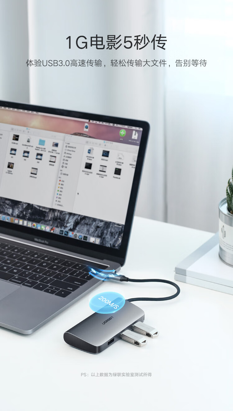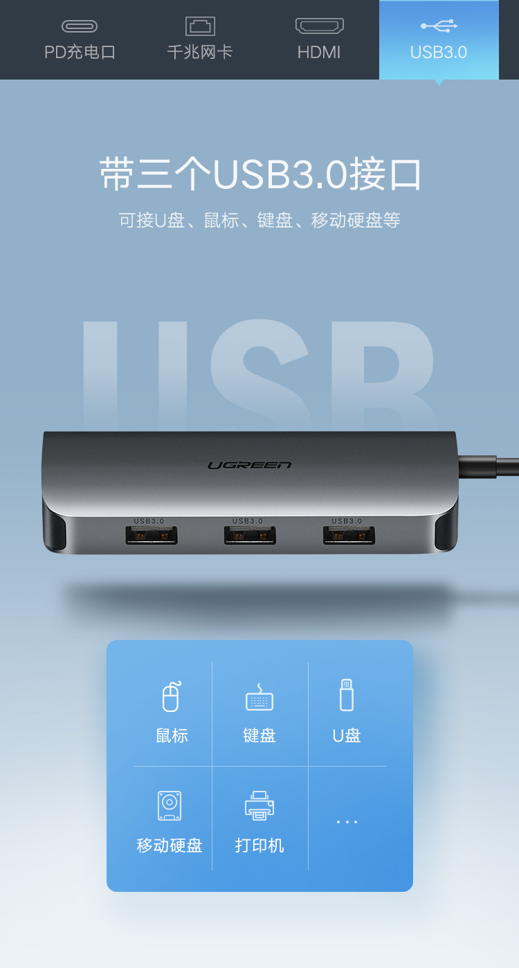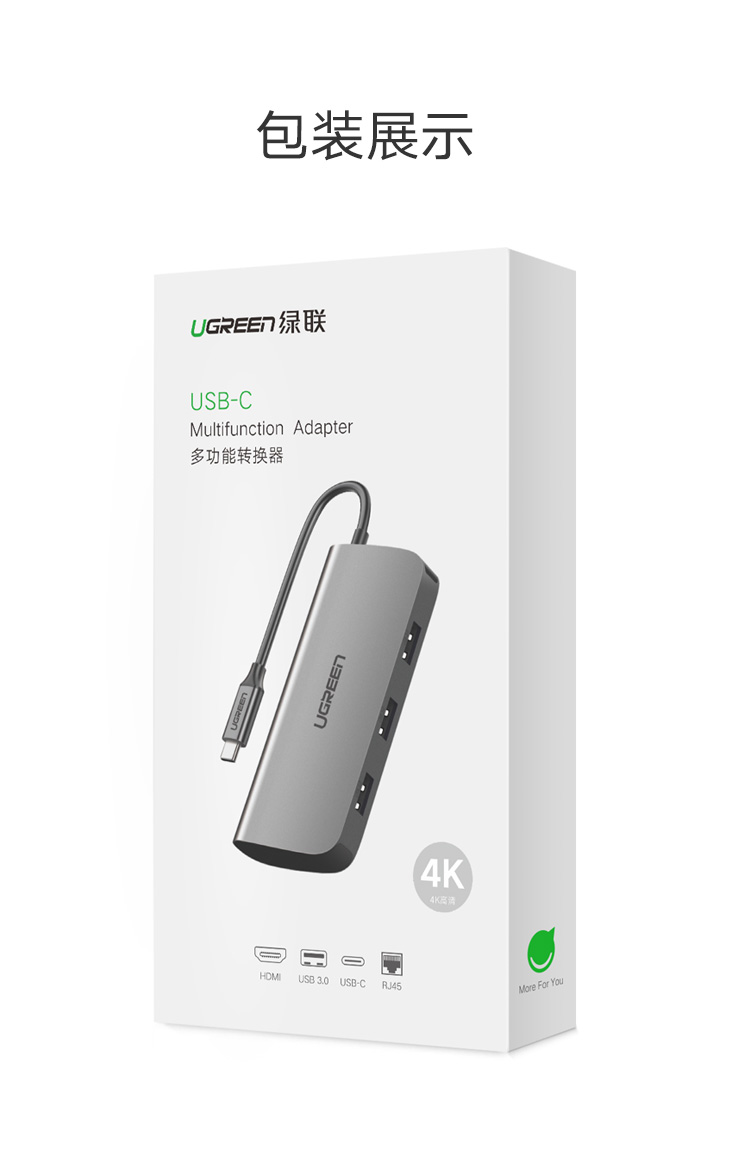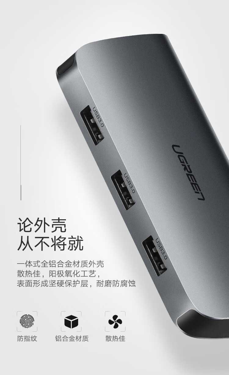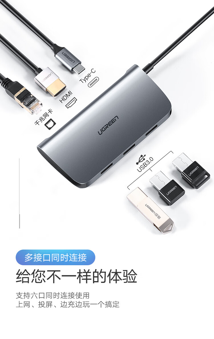 类型:转换器/转接线,PD快充,Type-C扩展坞;适用机型:其他,MAC;品牌:绿联(UGREEN);配件类型:转换器;包装清单:Type-C转HDMI+3*USB3.0+千兆网口转换器*1;