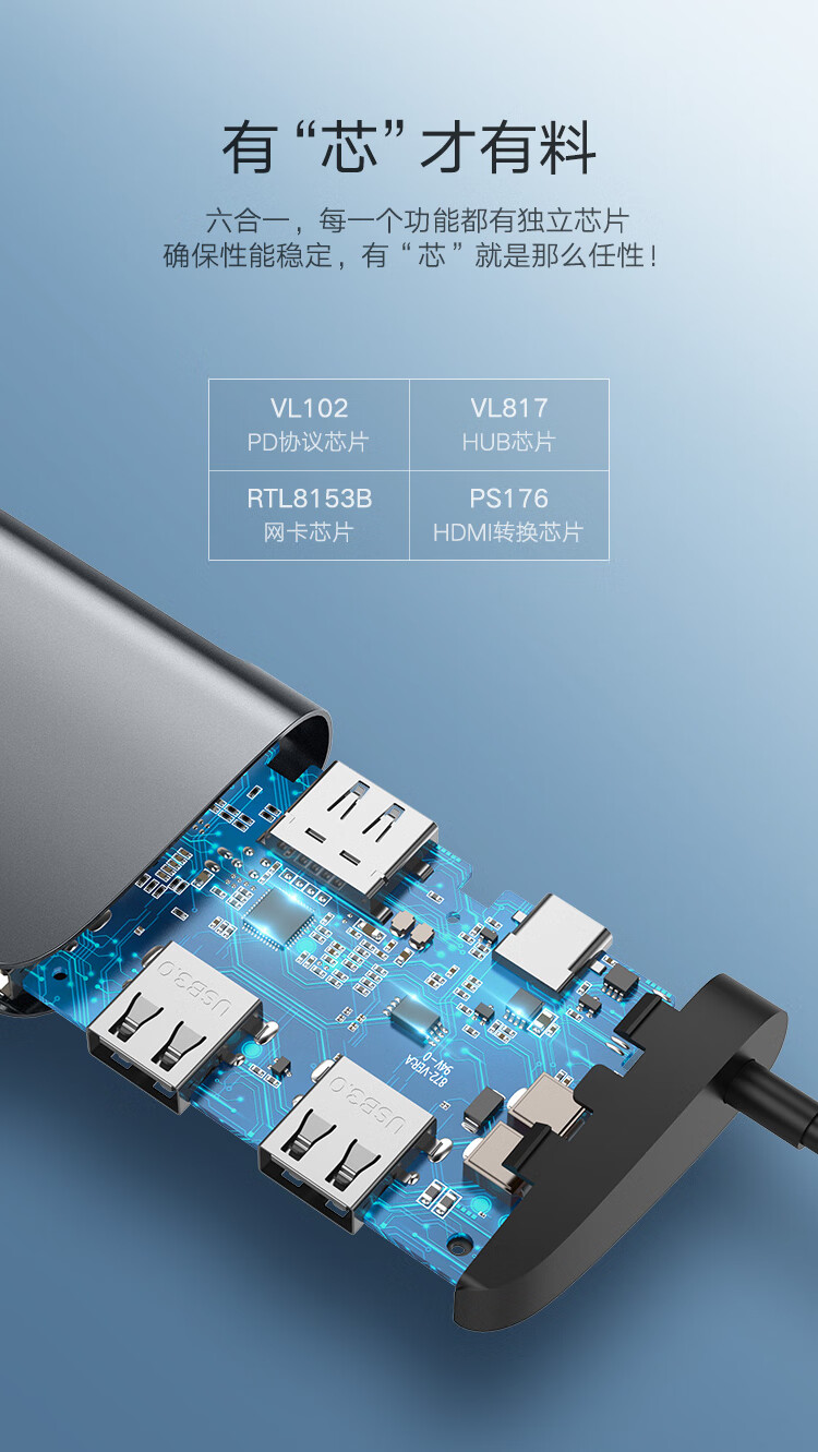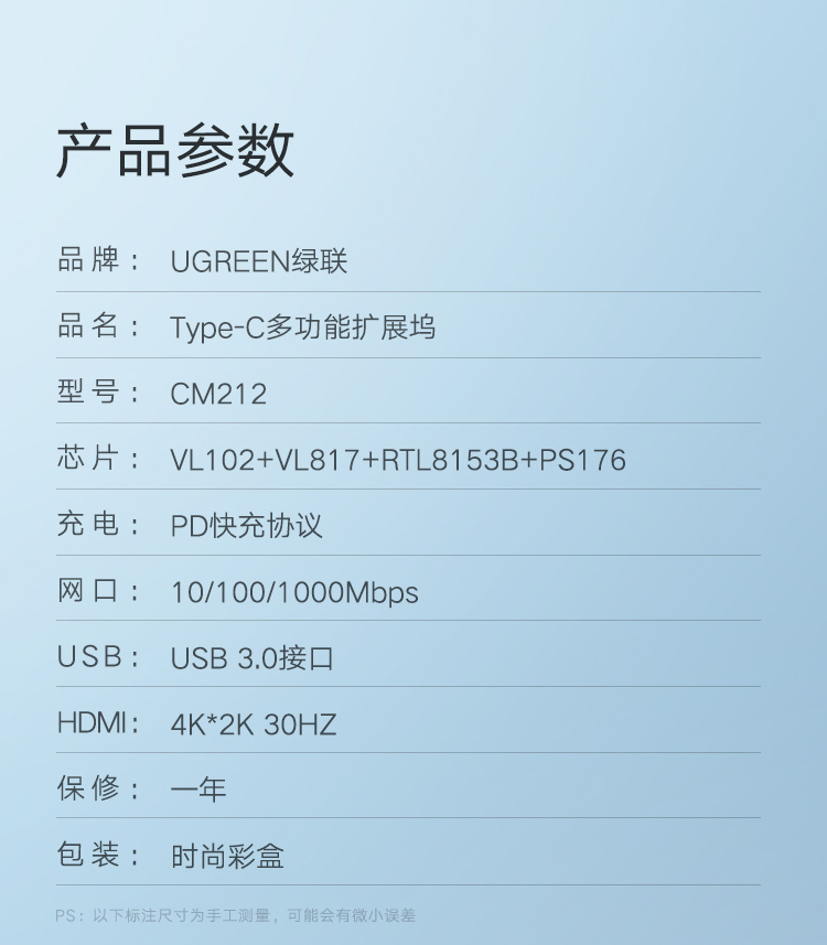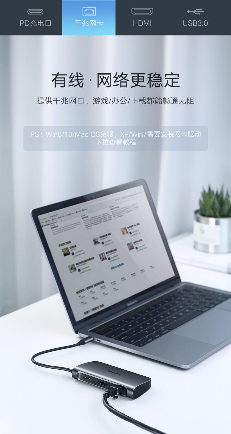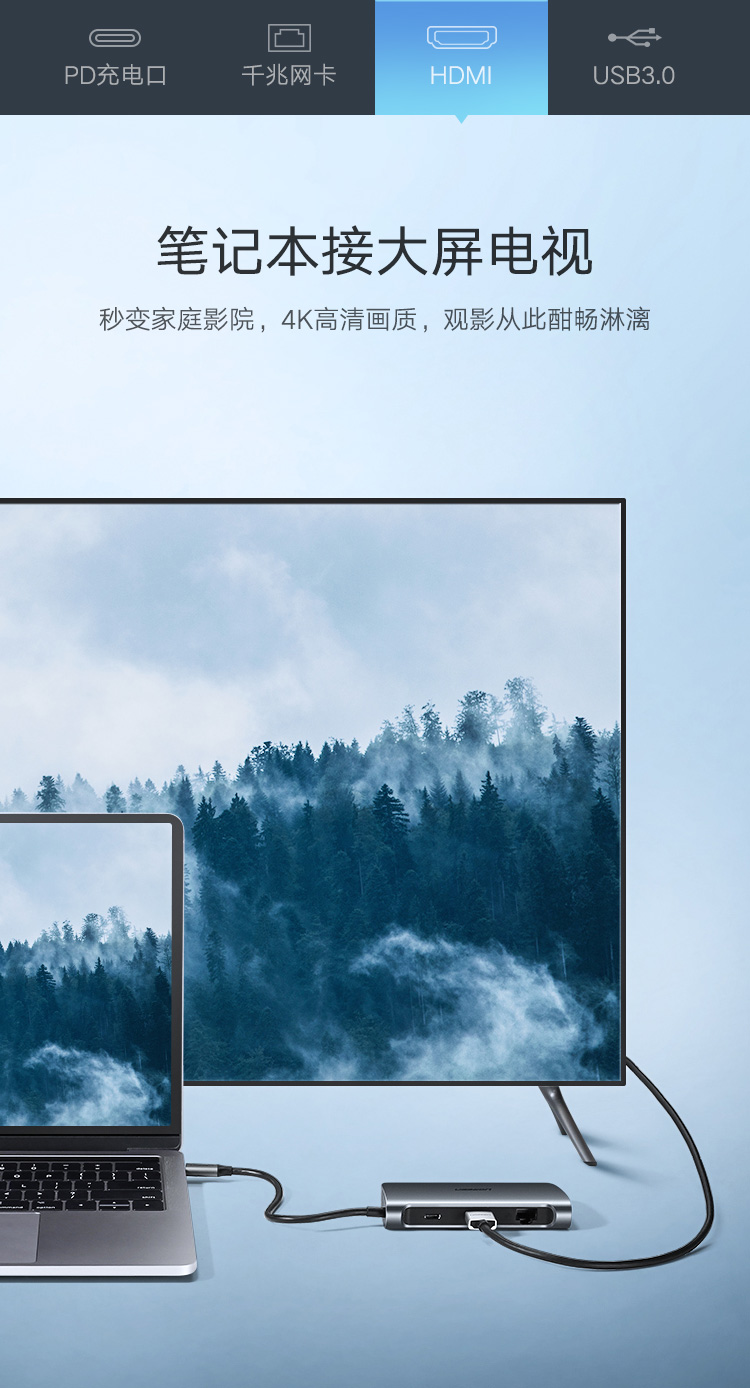 类型:转换器/转接线,PD快充,Type-C扩展坞;适用机型:其他,MAC;品牌:绿联(UGREEN);配件类型:转换器;包装清单:Type-C转HDMI+3*USB3.0+千兆网口转换器*1;