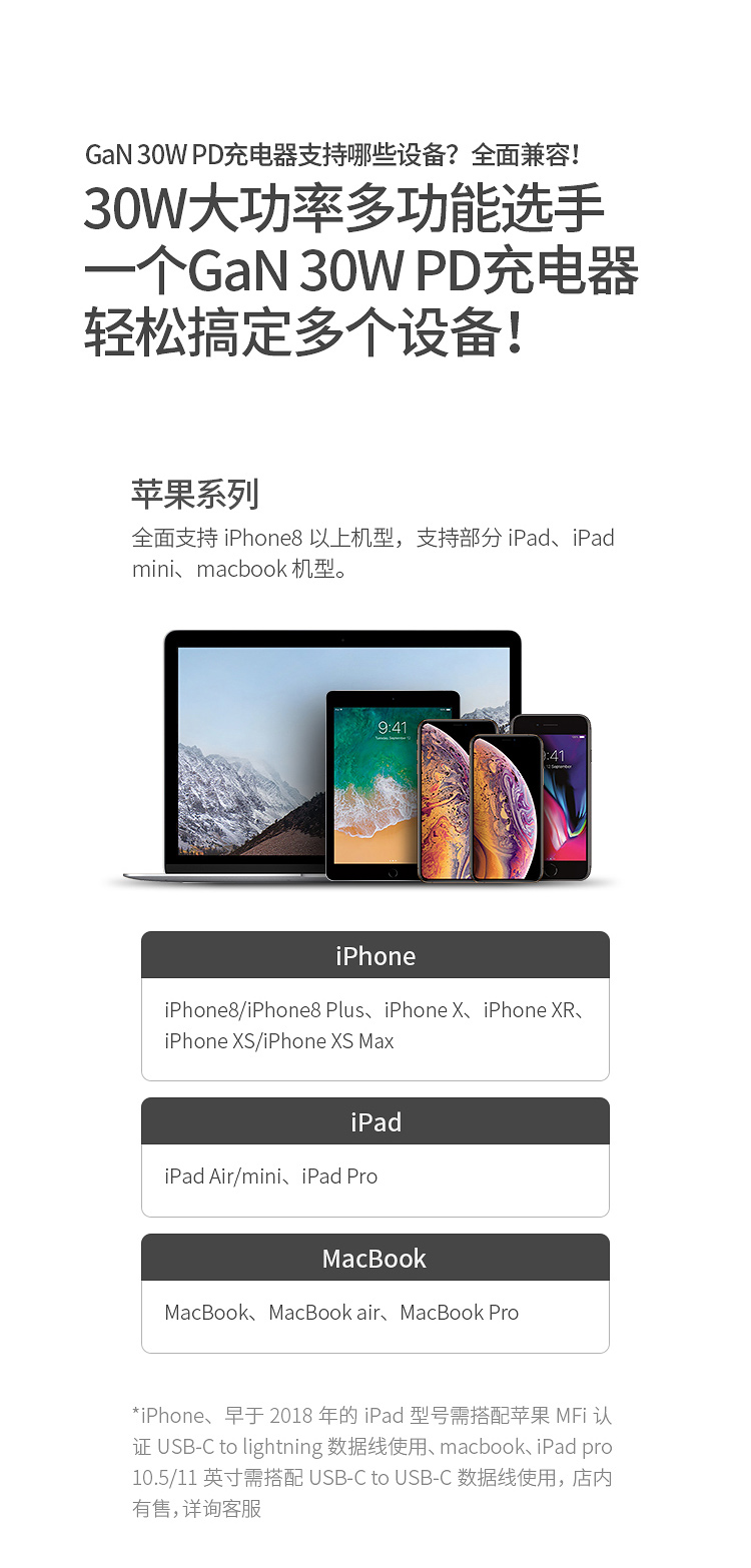 类型:氮化镓,充电插头,PD快充;附加功能:30W以上,PD快充;插口:Type-c接口,单口;适用手机品牌:通用;型号:A2017;输入电压(v):100-240v;输出电流 给手机充电的最大电流,这个数据主要就是影响给手机充电的速度:USB PD输出:5V=3A/9V=3A/15V=2A/20V=1.5A;输出电压(v):5V/9V/15V/20V;输入电流:1.2A;包装清单:氮化镓单口PD 30W充电器*1;说明书*1;