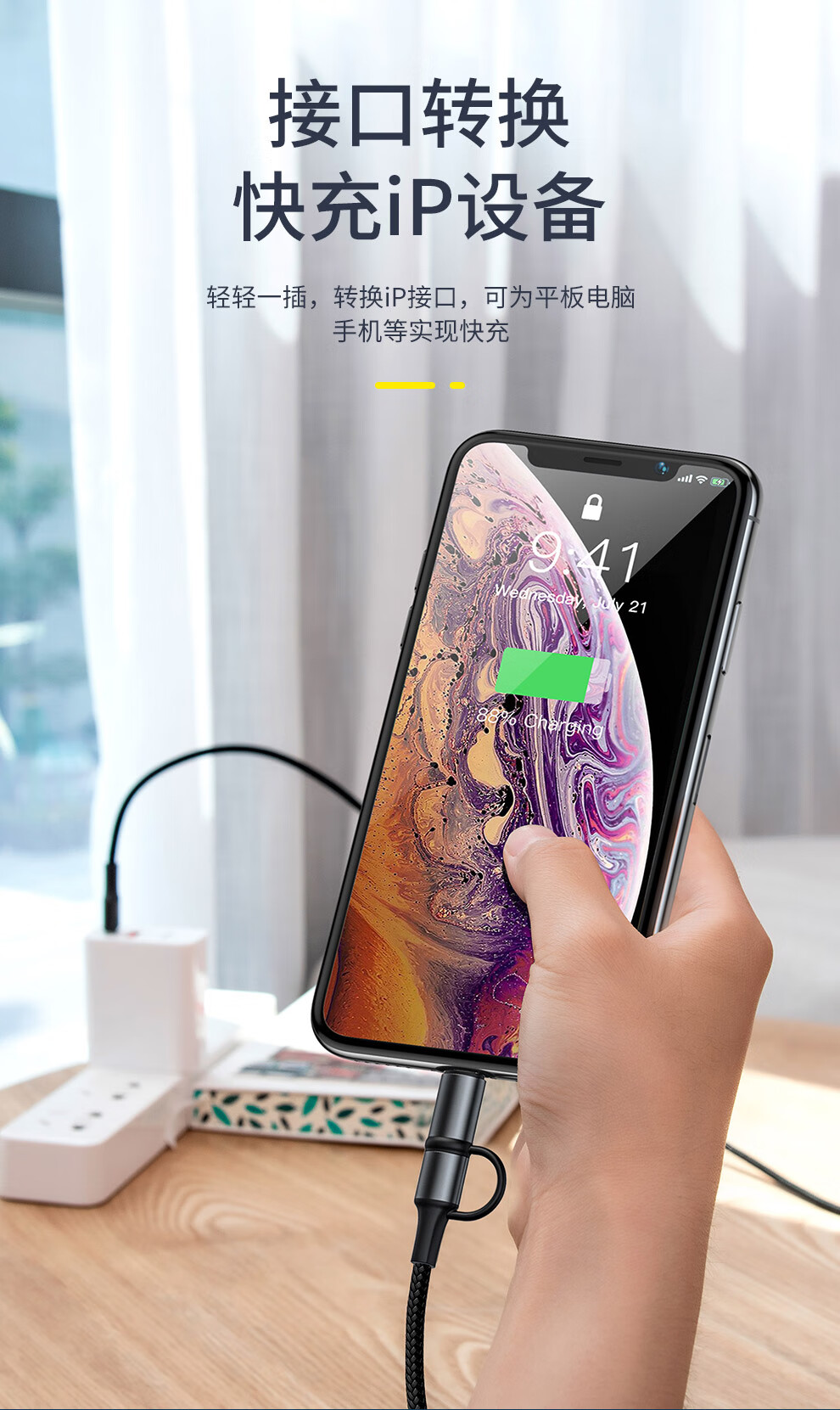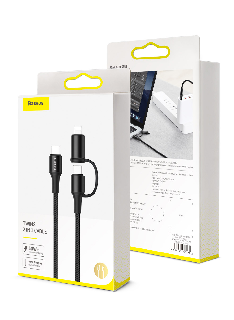 类型:单条装;接口:苹果;特点:其他,扩展转接;材质:编织;长度:1米;品牌:倍思 (Baseus);颜色:黑色;型号:二合一PD数据线;充电接口:Lightning;包装清单:倍思双子二合一PD数据线 Type-C TO Type-C 60W(20V/3A )+iP(5V/2A)1m 黑色×1、保修卡×1;