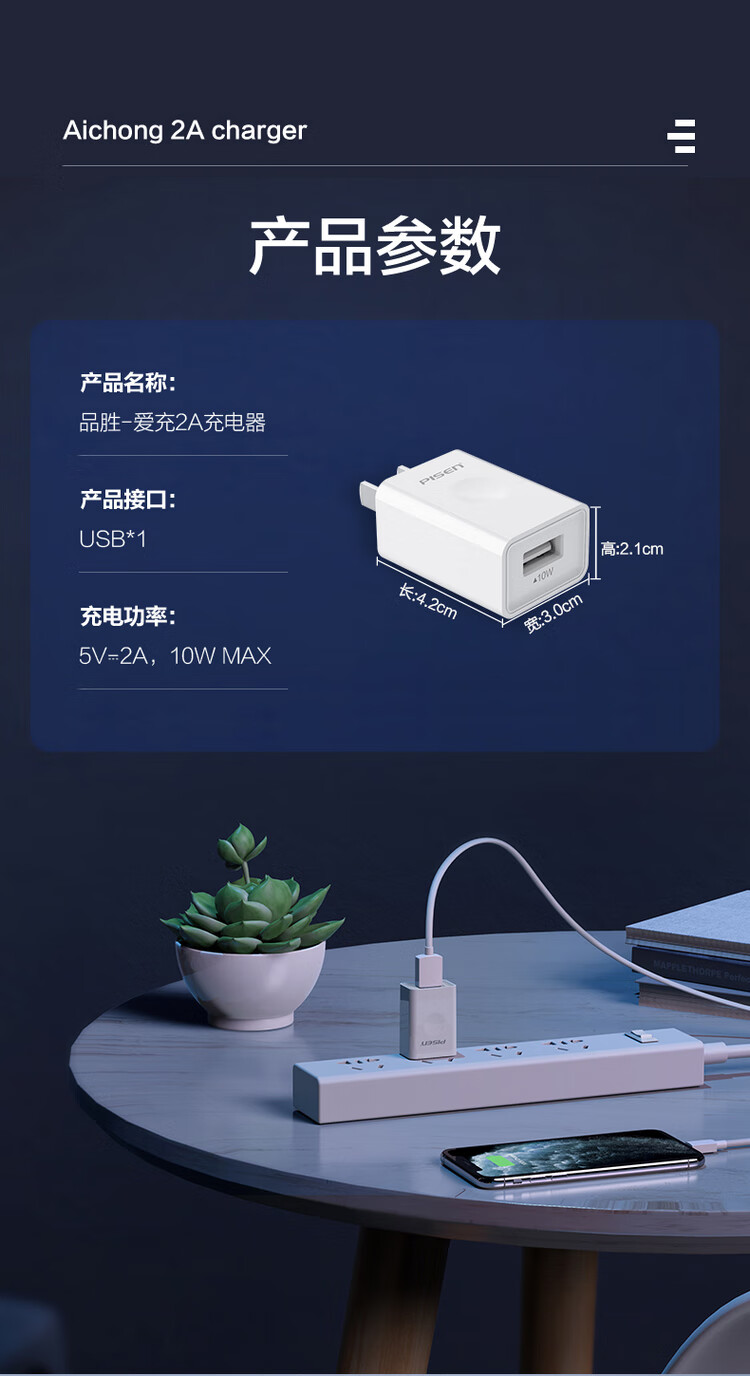 类型:充电插头;插口:单口;适用手机品牌:通用;型号:爱充2A (不含数据线);输入电压(v):100-240V-50/60Hz;输出电压(v):5V-2A;包装清单:爱充2A× 1;