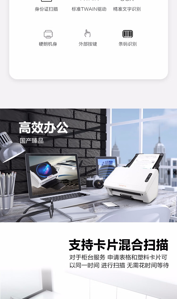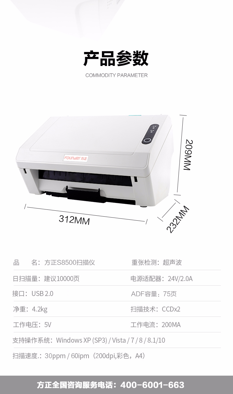 类型:馈纸式;幅面:A4;分辨率:600dpi;感光元件:CCD;接口:USB 2.0;扫描范围:A4(210mm*297mm);操作系统:WIN2000/ XP/ VISTA / 7 / 8 /10;扫描介质:文档、单据、身份证、笔记、图片、照片、杂志、书籍等;扫描速度:30ppm/60ipm(200DPI,A4 彩色、黑白、灰度);品牌:方正 Founder;认证型号:S8500;产品尺寸(mm):312*232.5*209.5mm(长*宽*高);产品净重(kg):4.2KG;包装清单:扫描仪主机x1,防尘罩X1,入纸托盘X1,电源适配器X1,USB通讯线X1,操作指南X1,光盘X1,上通道扭力套X2,方正科技扫描仪系列产品服务承诺X1;