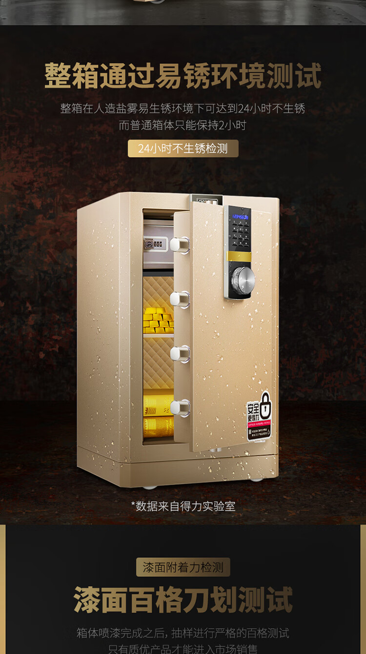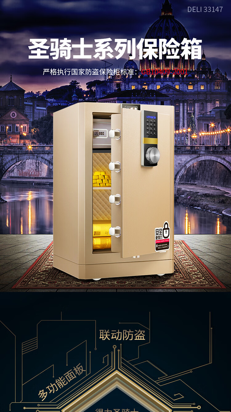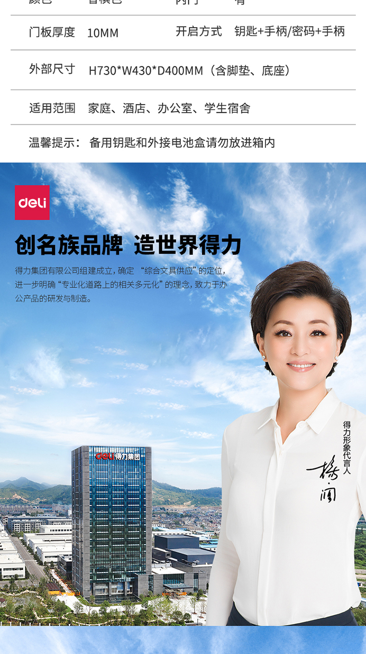 显示屏:LED数码屏显示;门板厚度:8-10mm;开锁方式:钥匙解锁,密码解锁;执行标准:国家3C标准;门型:单开门;外观高度:30.1-44.9cm;箱体厚度:4-6mm;应急开启:应急钥匙;报警功能:蜂鸣器报警;主机械钥匙:有,且可自行选择是否使用;开门方式:手动开门;门板形式:实心;优选服务:免费教学;重量:50-100kg;品牌:得力;产品尺寸(mm):H730*W430*D400;产品净重(kg):88kg;包装清单:保险柜×1、钥匙×2、智能人体感应灯×1、膨胀螺栓×2、外接电池盒×1、电池×4、说明书&保修卡×1;