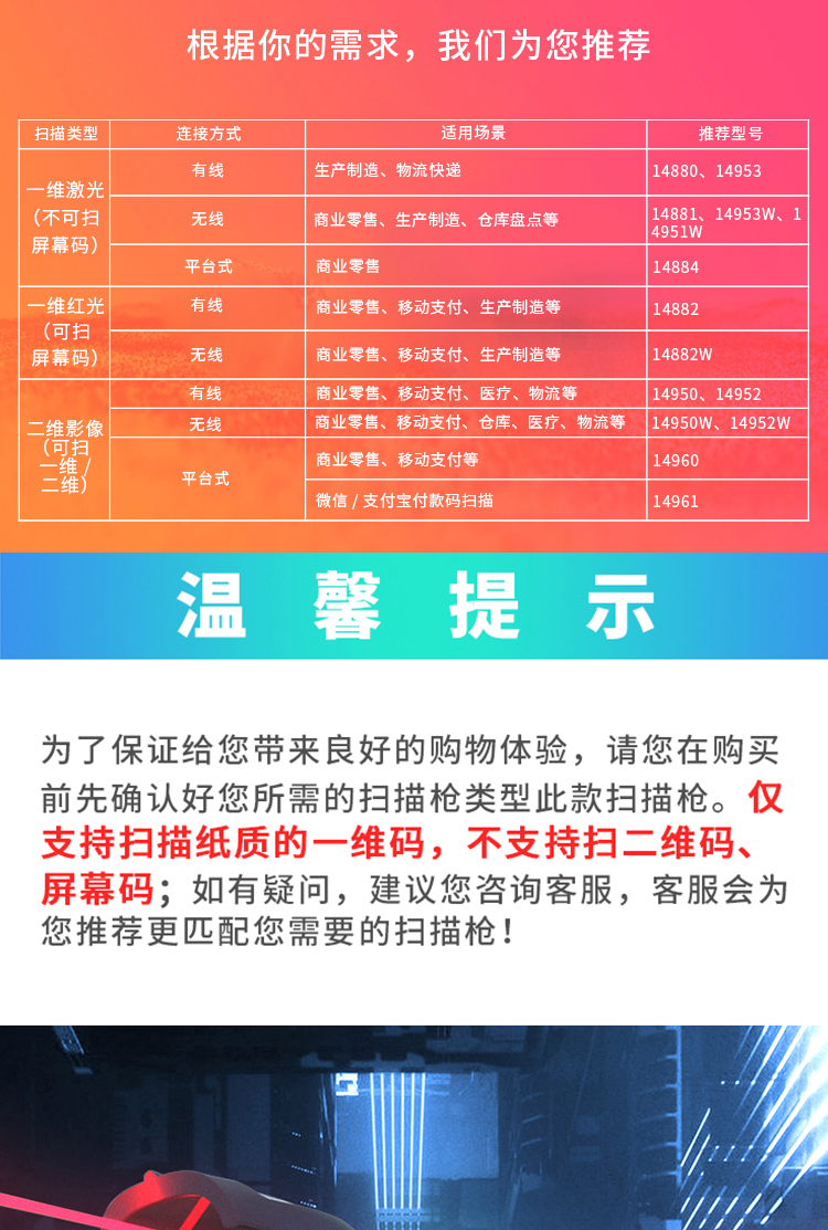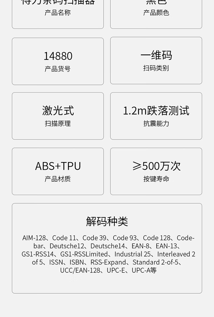 传输方式:有线;存储容量:不支持存储;扫描介质:纸质;无线传输类型:不支持无线传输;光源:激光;电池容量:无电池容量;解码类型:一维;无线传输距离:不支持无线传输;品牌:得力;颜色:白色;型号:14880;认证型号:14880;产品净重(g):380g;抗震能力:3M以上;扫描精度:4mil;包装清单:扫描枪×1、USB线×1、说明书×1、保修卡×1;