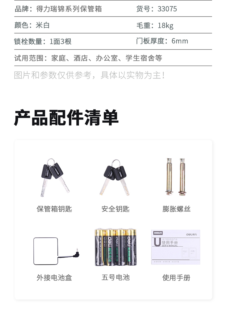 显示屏:LED数码屏显示;门板厚度:2-5mm;开锁方式:钥匙解锁,密码解锁;执行标准:企业标准;门型:单开门;外观高度:30.1-44.9cm;箱体厚度:4mm以下;应急开启:主钥匙+应急钥匙;报警功能:蜂鸣器报警;主机械钥匙:必须使用;开门方式:手动开门;门板形式:实心;重量:16-30kg;品牌:得力;产品尺寸(mm):H320*W380*D290;产品净重(kg):17kg;包装清单:保管箱×1 说明书×1 门锁钥匙×2 应急钥匙×2 膨胀螺栓×2 外接电池盒×1 5#电池×4;
