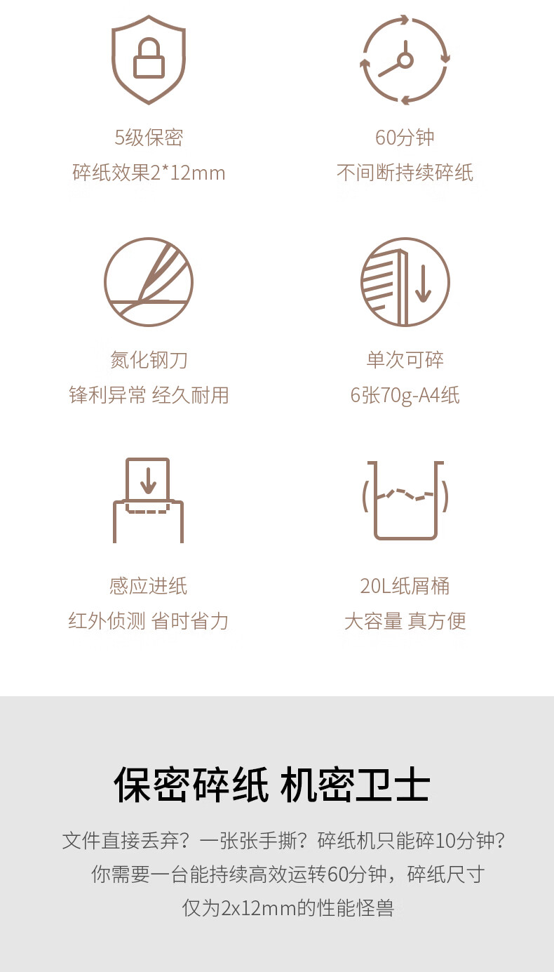 单次碎纸张数:6-10张;最大碎纸幅面:A4;连续碎纸机时间:31-40分钟;可碎介质:纸,回形针、订书针;噪音分贝:50-60dB;保密等级:5级;安全触停:有安全触停;移动轮:有移动轮;类型:长时间碎纸机;纸箱容量:11-20L;特殊功能:自动休眠,自动反向退纸;碎纸效果:米粒状;优选服务:上门服务,免费教学;碎纸速度:1-2米/分钟;颜色:白色;型号:33152;碎纸量(页):1500张以上;碎纸宽度:220mm;产品尺寸(mm):350mm*255mm*550mm;功率:200W;产品净重(kg):8kg;包装清单:碎纸机×1;
