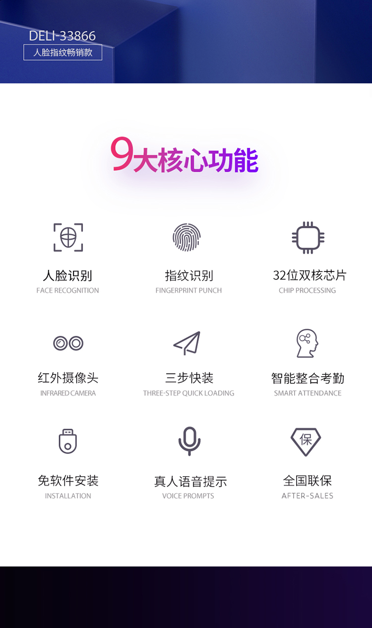 类型:人脸+指纹识别;版本:免软件版;优选服务:免费教学;输出方式:U盘下载;云考勤:不支持云考勤;品牌:得力(deli);型号:33866;产品尺寸(mm):183mm*130mm*34mm;产品净重(kg):0.32kg;门禁功能:不支持;指纹容量:1500;面部识别容量:300;处理器:双核;记录容量:15万;摄像头:双摄;显示屏:2.8英寸;包装清单:考勤机×1 操作说明书×1 电源适配器×1 合格证×1 保修卡×1;