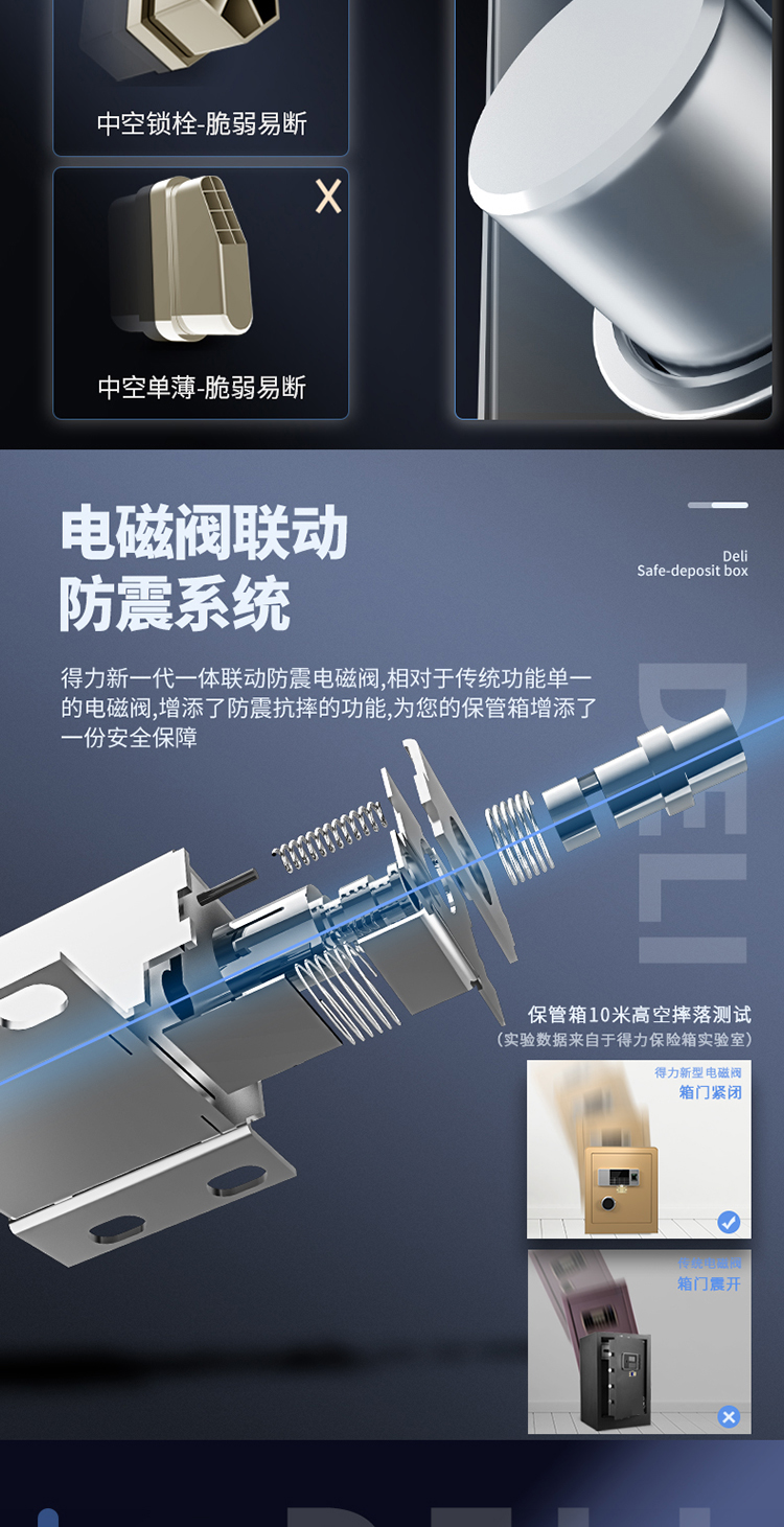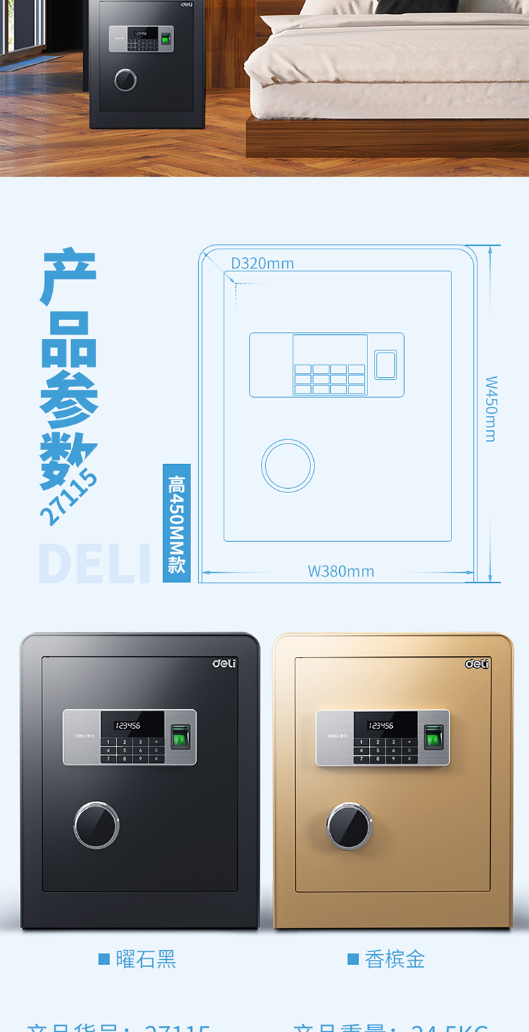 显示屏:LED数码屏显示;门板厚度:2-5mm;开锁方式:钥匙解锁,密码解锁,指纹解锁;执行标准:企业标准;门型:单开门;外观高度:45-60cm;箱体厚度:4mm以下;应急开启:主钥匙+应急钥匙;报警功能:蜂鸣器报警;主机械钥匙:必须使用;开门方式:手动开门;门板形式:实心;优选服务:免费教学;重量:16-30kg;品牌:得力;产品尺寸(mm):H450*W380*D320;产品净重(kg):24kg;包装清单:得力保险箱27115×1,说明书×1,门钥匙×2,应急钥匙×2,膨胀螺丝×2,内门钥匙×2,5号电池×4,外接电池盒×1;