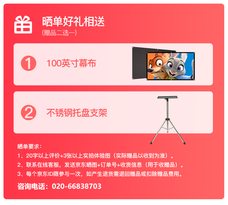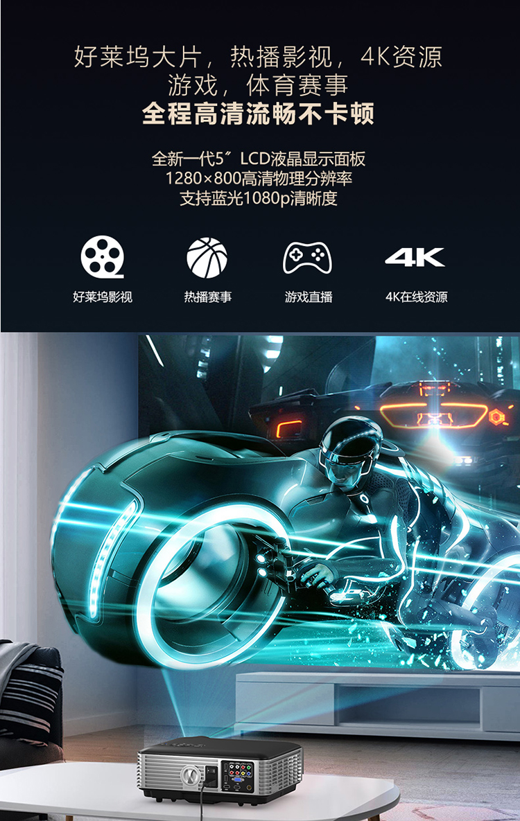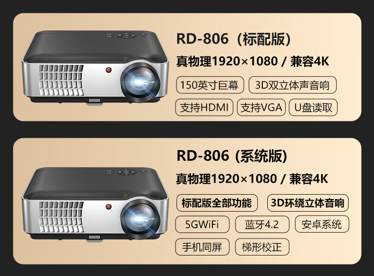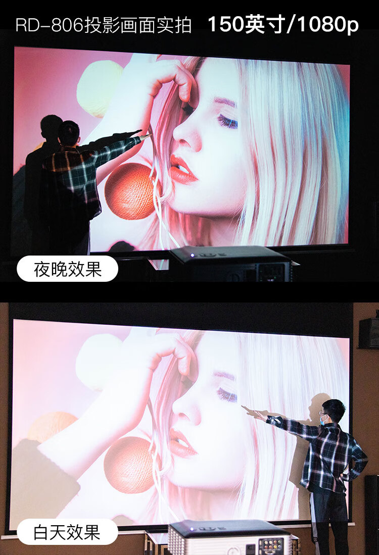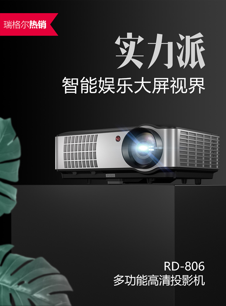 优选服务:两年质保;应用场景:客厅娱乐,激光电视,家庭影院,会议办公,展览场馆;梯形矫正:四向矫正;自动梯形矫正:自动;标准分辨率:1920X1080dpi;镜头光圈(F/f):以实物为准;对比度 投影机输出图像中最亮部区域与最暗部区域的亮度比值,即白与黑的比值:1000:1以下;最大兼容分辨率:1920X1080dpi;镜头材质:玻璃+树脂;光源功率:LED;变焦比例:以实物为准;镜头位移:以实物为准;投射比:1.2:1;显示芯片尺寸:以实物为准;显示比例:16:10;16:9;100"投影距离 100英寸画面投影镜头到屏幕的距离范围:以实物为准;均匀度:98%;真实亮度:3000-3999ANSI流明;扬声器功率:3W*2;HDR类型:其他;语音遥控:不支持语音功能;品牌:瑞格尔(Rigal);建议尺寸范围:以实物为准;支持3D格式:红蓝3D;投影光源:LED;产品类别:品质家用;显示技术:3LCD;3D播放:支持3D功能;操作系统:有智能系统;安装方式:桌上正投;吊装正投;认证型号:RD-806;生产企业:广州瑞格尔电子有限公司;产品型号:RD-806;音频输入:x1;网络接口:x1;USB接口:x1;MHL接口:x1;音频输出:x1;无线同屏:支持无线;蓝牙连接:5.1;VGA接口:x1;RS232接口:x1;Type-C接口:无;HDMI接口:x1;U盘直读支持格式:基本都支持;机身颜色:黑色;产品尺寸(mm):336×263×118;噪音(dB):28dB(1米距离);电源:110V-220V;镜头盖:无镜头盖;产品净重(kg):3.5kg;机身材质:PC/ABS化合物;整机功耗(W):135W;包装清单:投影机x1/用户使用手册x1/电源适配器x1/遥控器x1/Mirco USB线x1;