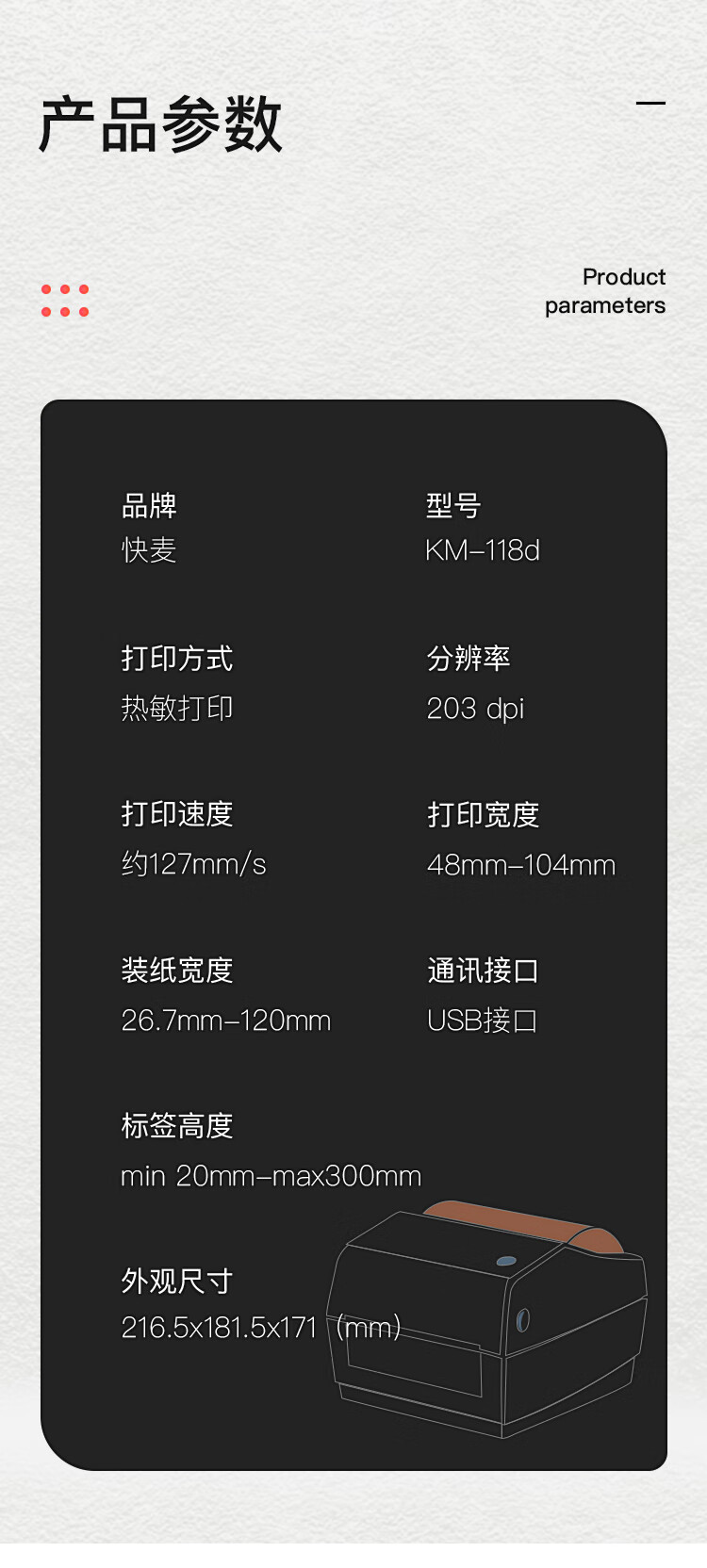 自动双面打印:不支持自动双面打印;耗材类型:其他;使用场景:家庭打印,发票快递单,家庭办公;连接方式:有线;幅面:其他;优选服务:价保15天;技术类型:热敏;品牌:快麦;功能:打印;颜色:其他;型号:KM118D;认证型号:KM118D;打印机类型:黑白打印机;产品尺寸(mm):240*198*171mm;产品净重(kg):2.95;包装清单:打印机*1 usb数据线*1 电源线*1 用户手册*1;