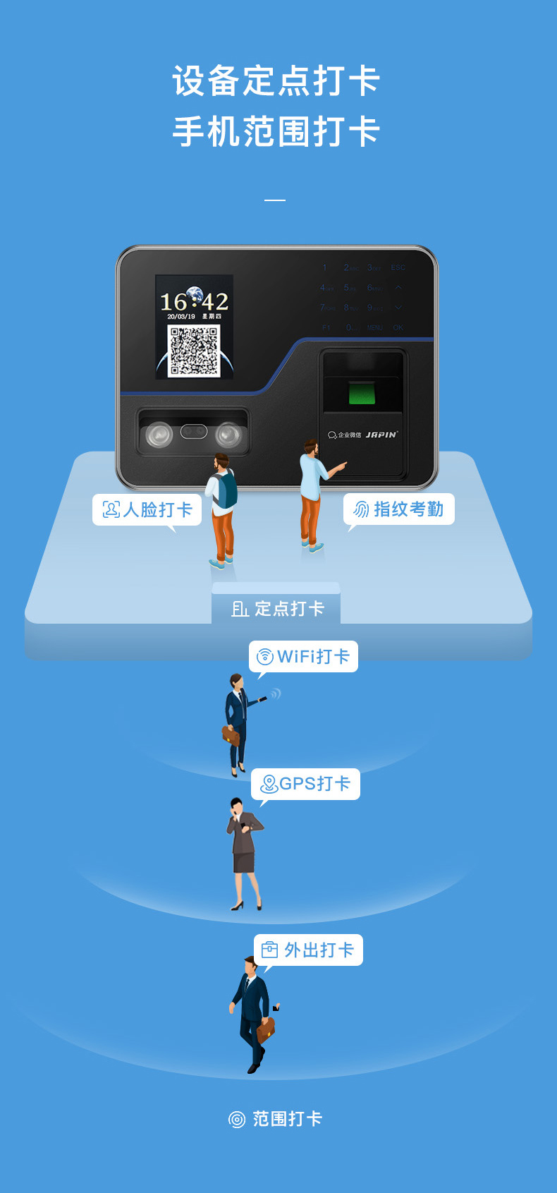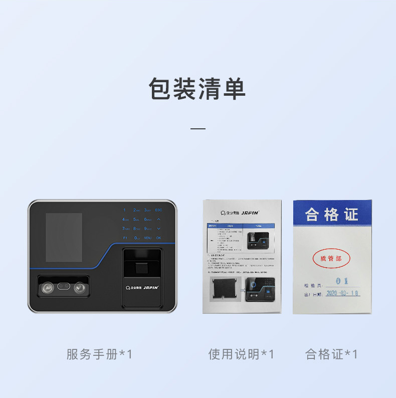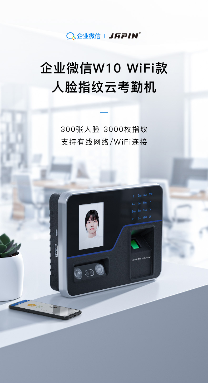 类型:人脸+指纹识别;版本:软件版;输出方式:wifi无线;云考勤:支持云考勤;品牌:嘉品;型号:W10;语音提示:支持;中文姓名:支持;门禁功能:无;通讯方式:有线+WIFI;指纹容量:3000/枚;面部识别容量:300/张;记录容量:100000;摄像头:30万像素;考勤功能:人脸指纹考勤机;包装清单:考勤机*1 电源线*1 保修卡*1 使用说明*1;