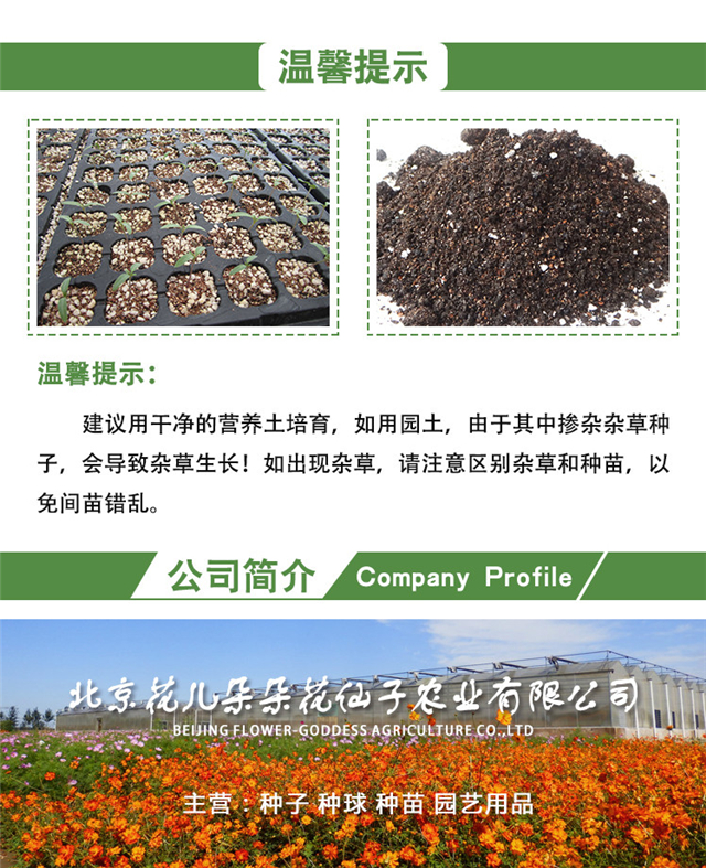 种类:草花;适种区域:东北,华北,华中,华东,华南,西南,西北;适播季节:春,夏,秋;国别:国产;类别:常规种子;种子经营许可证编号:D京丰农种经许字2013第0001号;包衣:无包衣;生产年份(年):2019年;芽率(%):86;水分(%):7.6%;净度(%):94.6%;纯度(%):93.4%;包装清单:种子一袋;