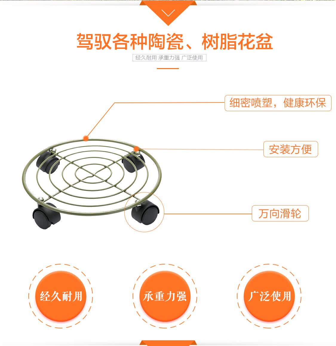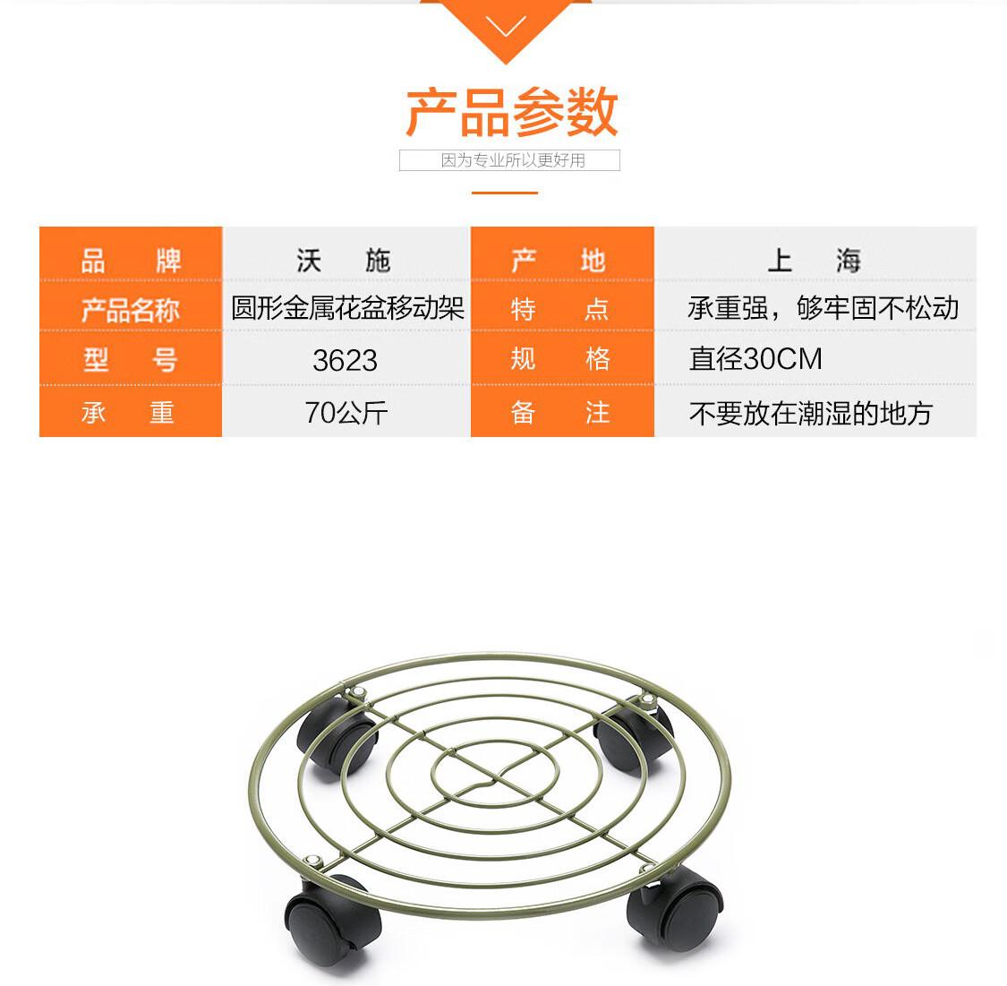 材质:金属;底部留孔:有孔;尺寸:26-30cm;品牌:沃施(worth);包装清单:圆形金属花盆移动架 x 1;