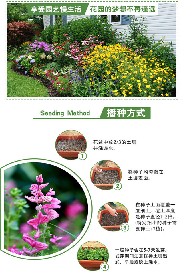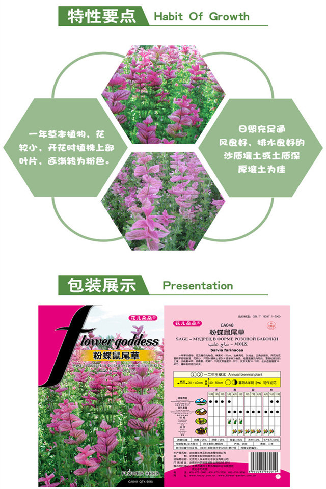 种类:草花;适种区域:东北,华北,华中,华东,华南,西南,西北;适播季节:春,秋;国别:国产;类别:常规种子;种子经营许可证编号:D京丰农种经许字2013第0001号;包衣:无包衣;生产年份(年):2019年;芽率(%):89;水分(%):7.6%;净度(%):96.4%;纯度(%):94.5%;包装清单:种子一袋;