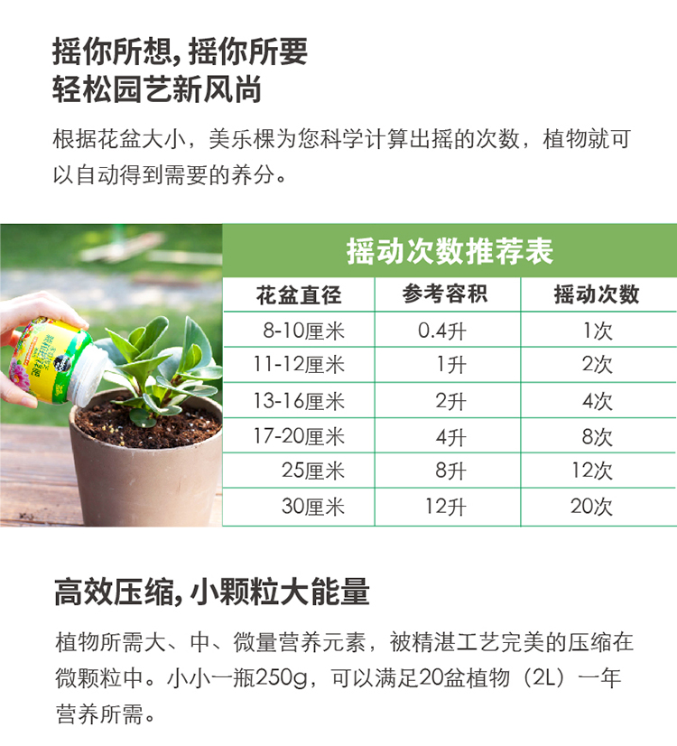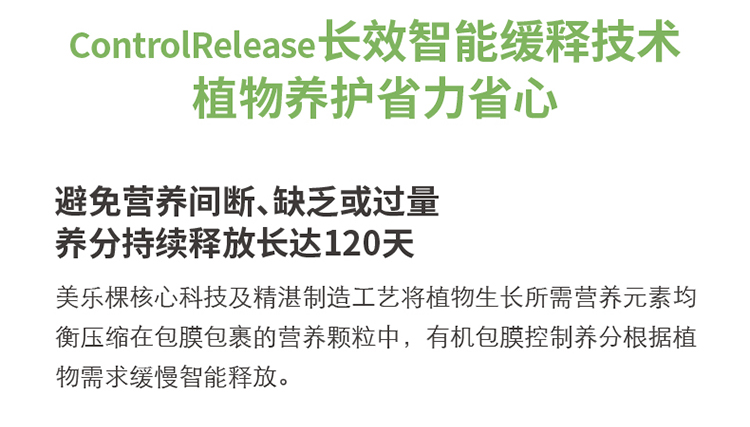 性状:固体;营养类型:控释肥;适用对象:观叶植物,观花植物,蔬菜水果,盆景,多肉植物,兰科植物,通用型;品牌:美乐棵;包装清单:商品×1;