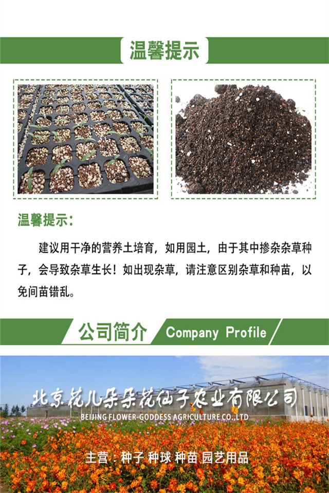 适播季节:春;国别:国产;类别:常规种子;种类:其他;适种区域:东北;种子经营许可证编号:D京丰农种经许字2013第0001号;包衣:有包衣;检疫证明编号:1101060020150040;生产年份(年):2019年;芽率(%):90%;水分(%):8.8%;净度(%):95.5%;纯度(%):95%;包装清单:种子一袋;