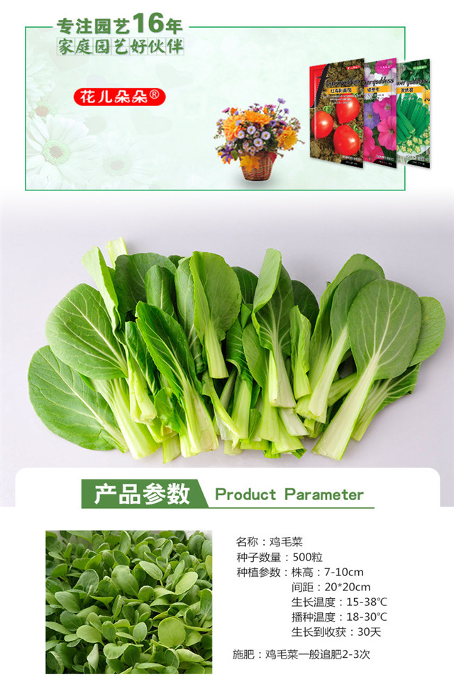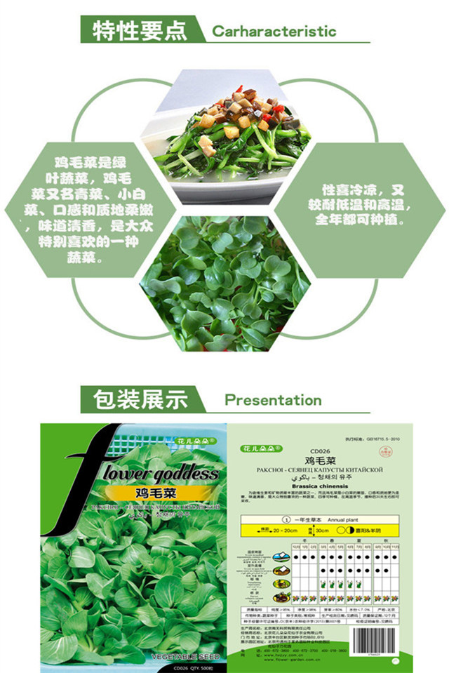 种类:叶菜类;适种区域:东北,华北,华中,华东,华南,西南,西北;适播季节:春,夏,秋;国别:国产;类别:常规种子;种子经营许可证编号:D京丰农种经许字2013第0001号;包衣:无包衣;检疫证明编号:11010600201500040;芽率(%):91%;生产年份(年):2019年;水分(%):8.9%;净度(%):96.3%;纯度(%):97.5%;包装清单:种子一袋;