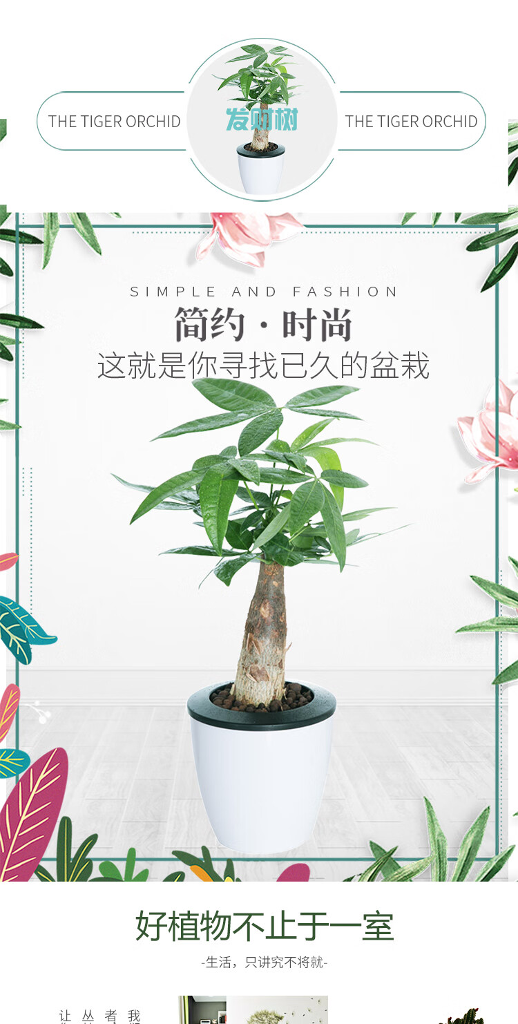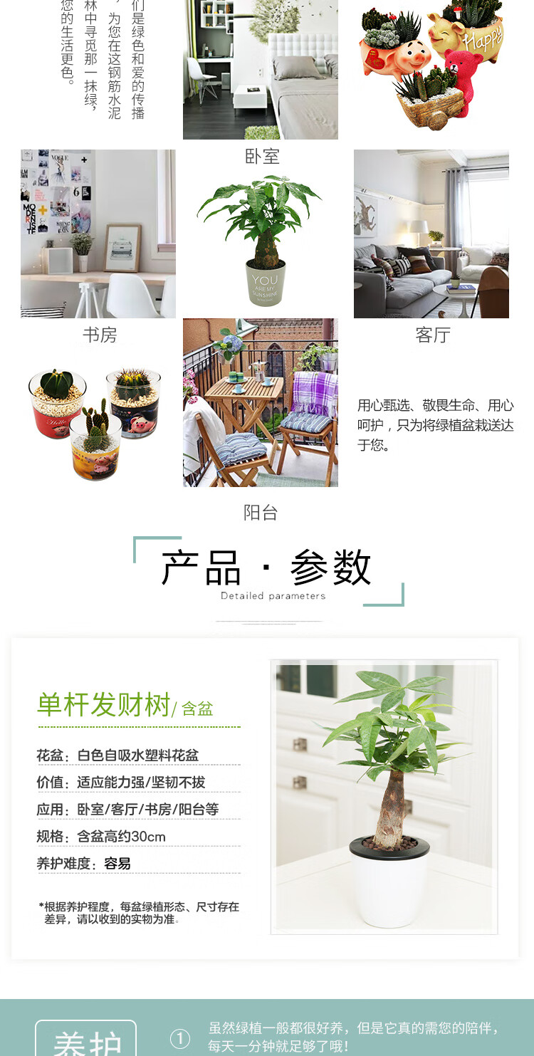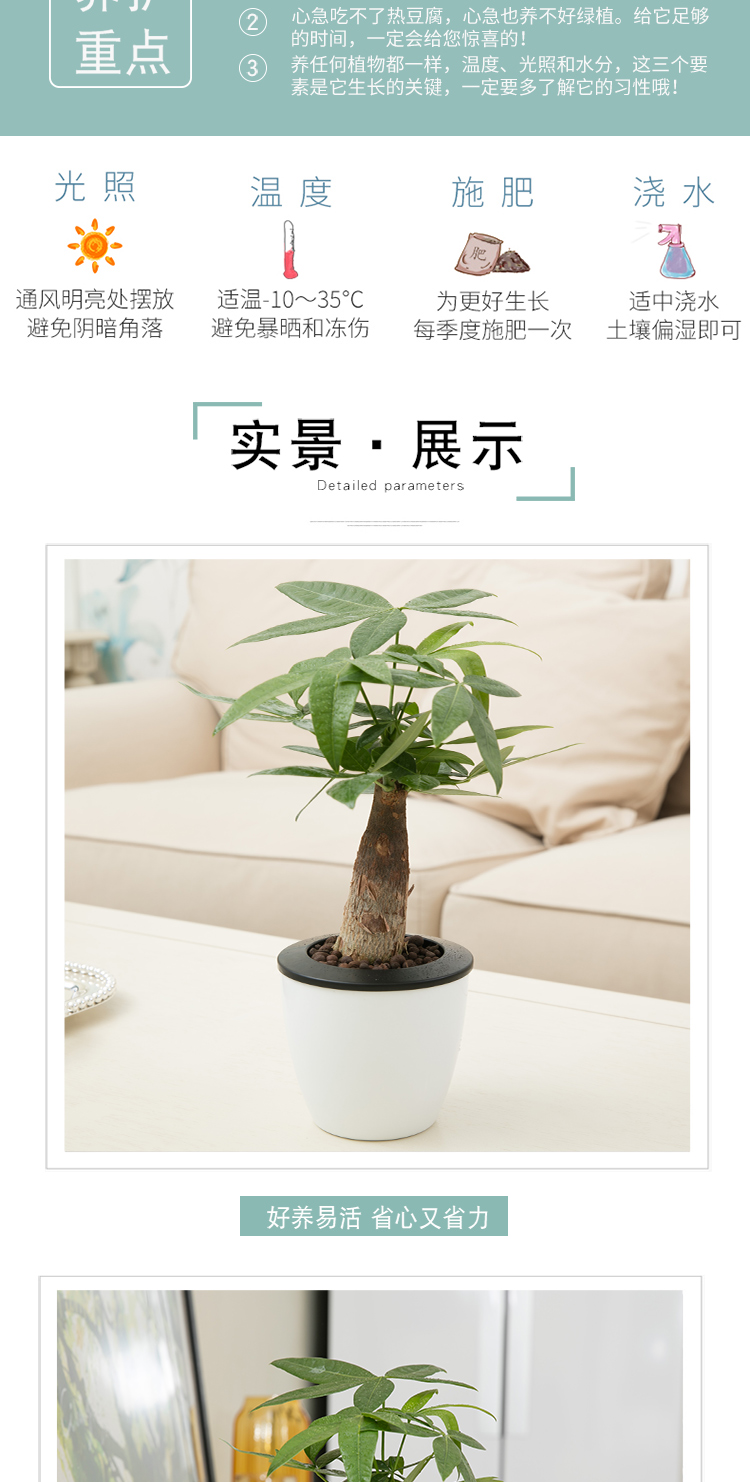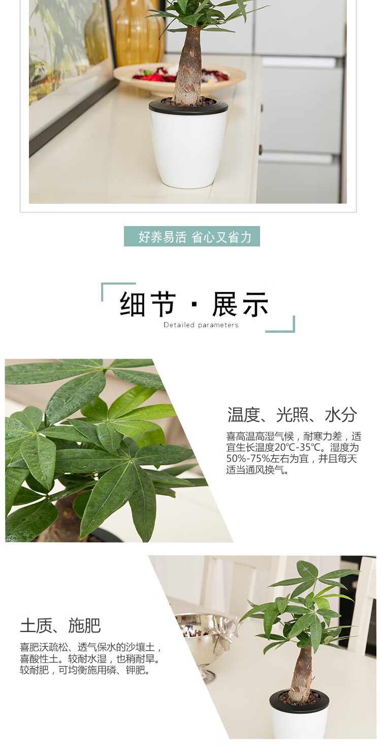 是否含花盆:带盆栽好;适用空间:庭院,阳台,客厅,办公桌,卧室,书房;植物品种:发财树;植物类别:观叶植物;包装清单:小发财树*1,花盆*1,包装箱*1;
