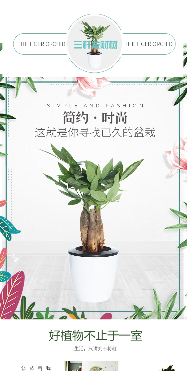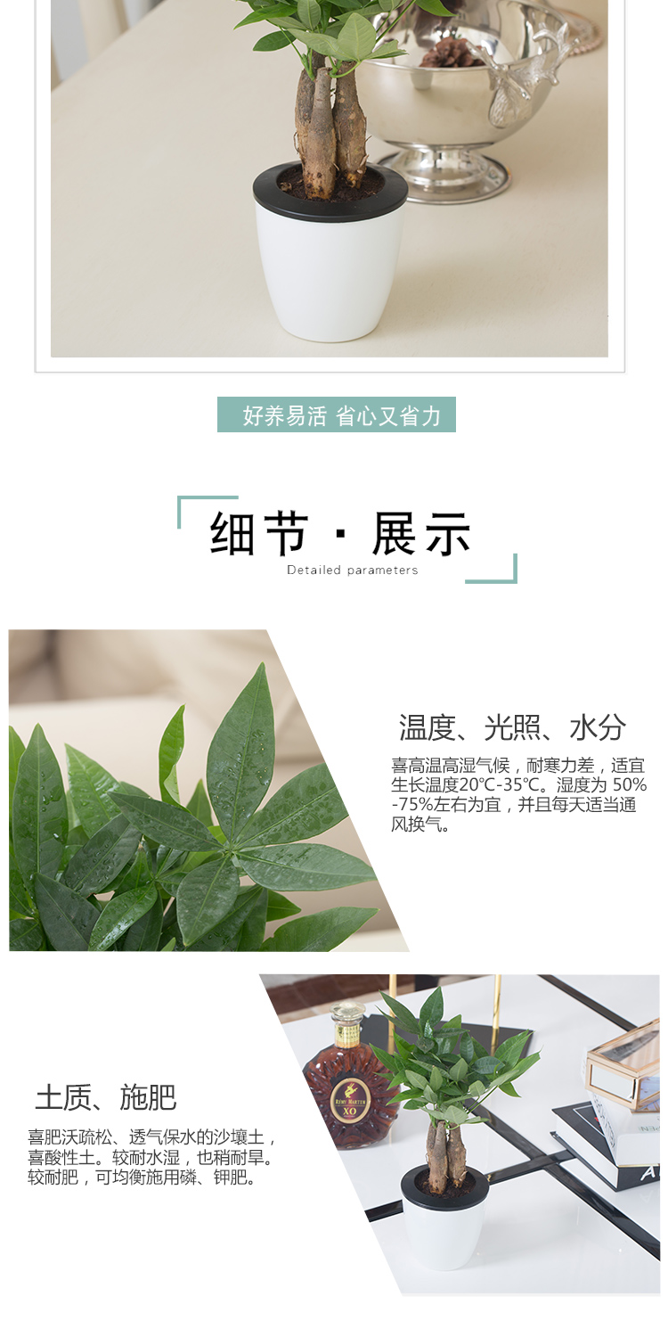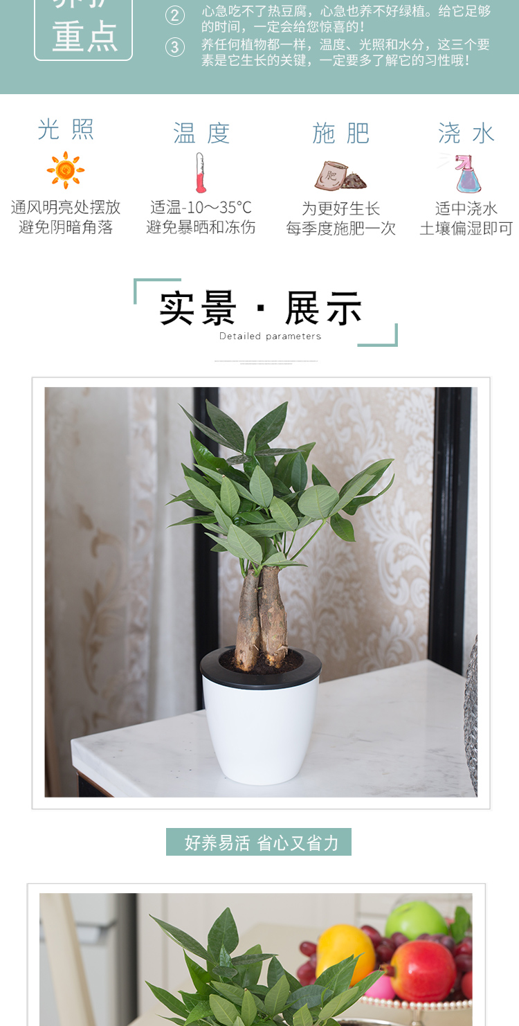 是否含花盆:带盆栽好;适用空间:庭院,阳台,客厅,办公桌,卧室,书房;植物品种:发财树;植物类别:观叶植物;包装清单:三杆发财树*1,花盆*1,包装箱*1;