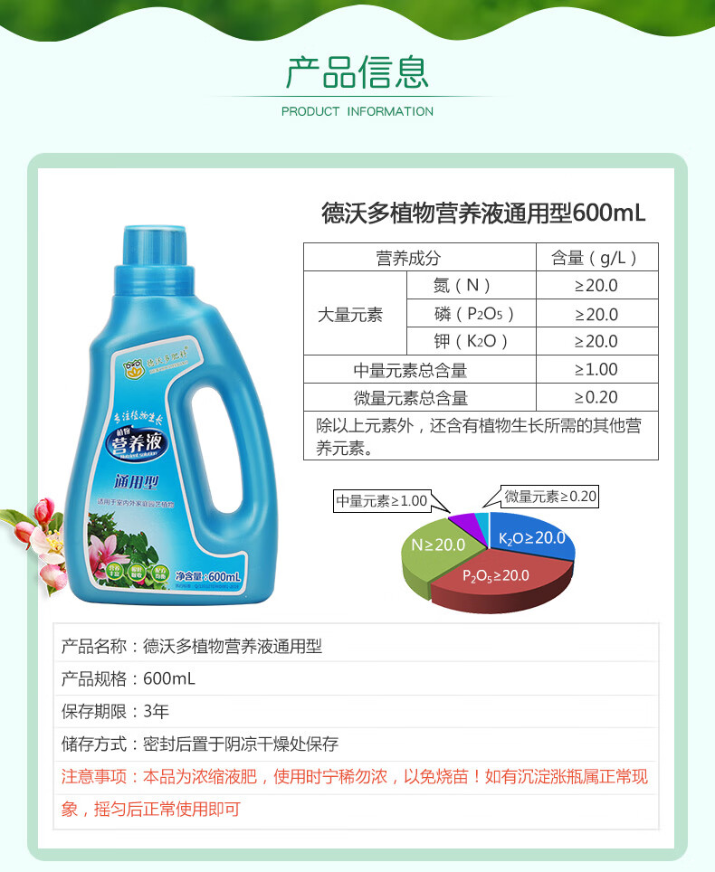 适用对象:通用型;性状:液体;营养类型:营养液;品牌:德沃多肥料;包装清单:600ml通用营养液*1瓶;