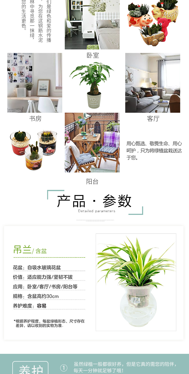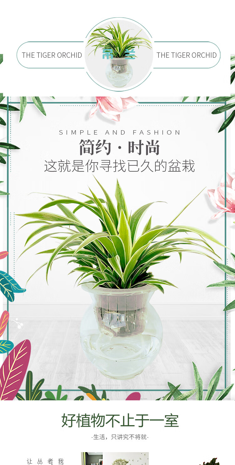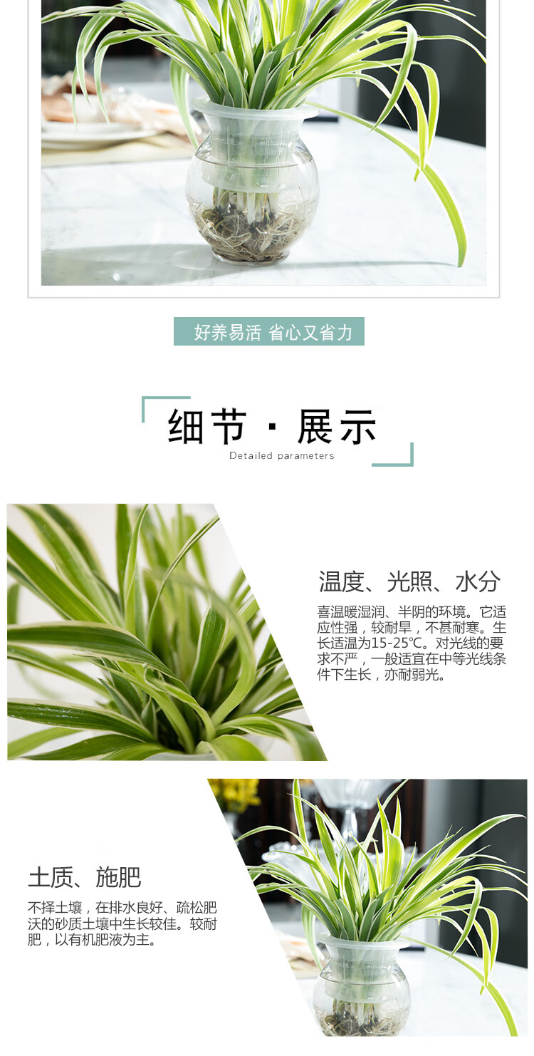 是否含花盆:带盆栽好;适用空间:庭院,阳台,客厅,办公桌,卧室,书房;植物品种:吊兰;植物类别:观叶植物;包装清单:水培系列—吊兰*1,花盆*1,包装箱*1;