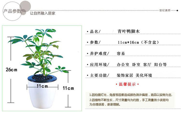 植物品种:鸭脚木;是否含花盆:含盆;植物类别:观叶植物;适用空间:阳台,客厅,办公桌,书房;包装清单:青叶鸭脚木X1 、 M3盆X1;