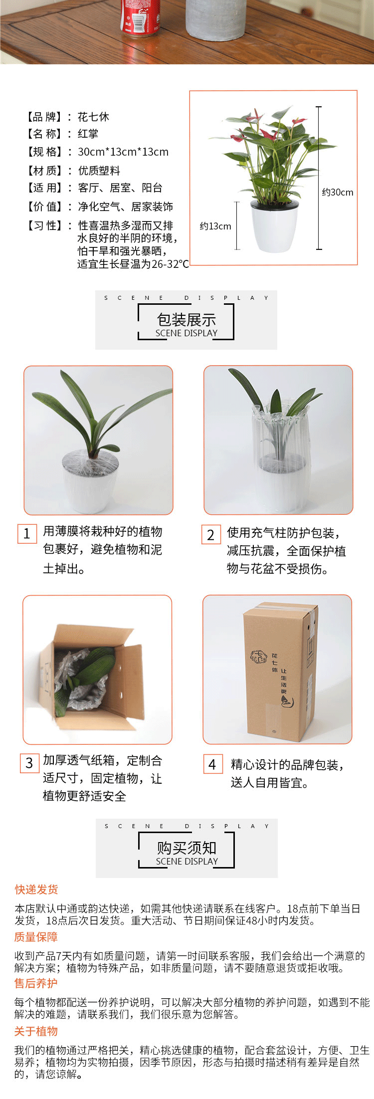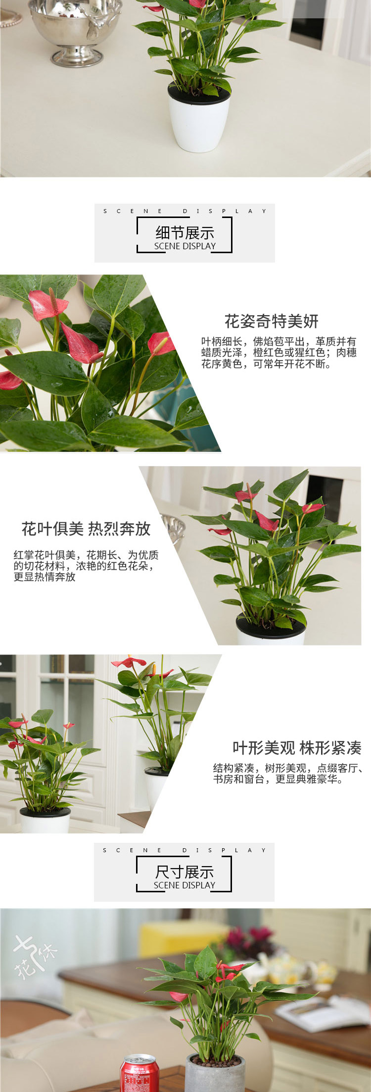 开花季节:长花期;是否含花盆:带盆栽好;适用空间:庭院,阳台,客厅,办公桌,卧室,书房;颜色:红色;包装清单:红掌*1,花盆*1,包装箱*1;