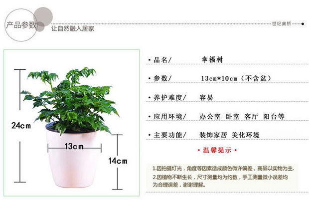 植物品种:幸福树;是否含花盆:含盆;植物类别:观叶植物;适用空间:阳台,客厅,办公桌,书房;包装清单:幸福树X1 、 M5盆X1;