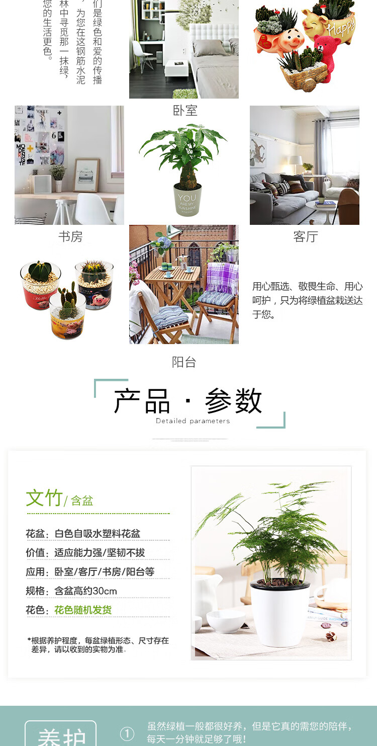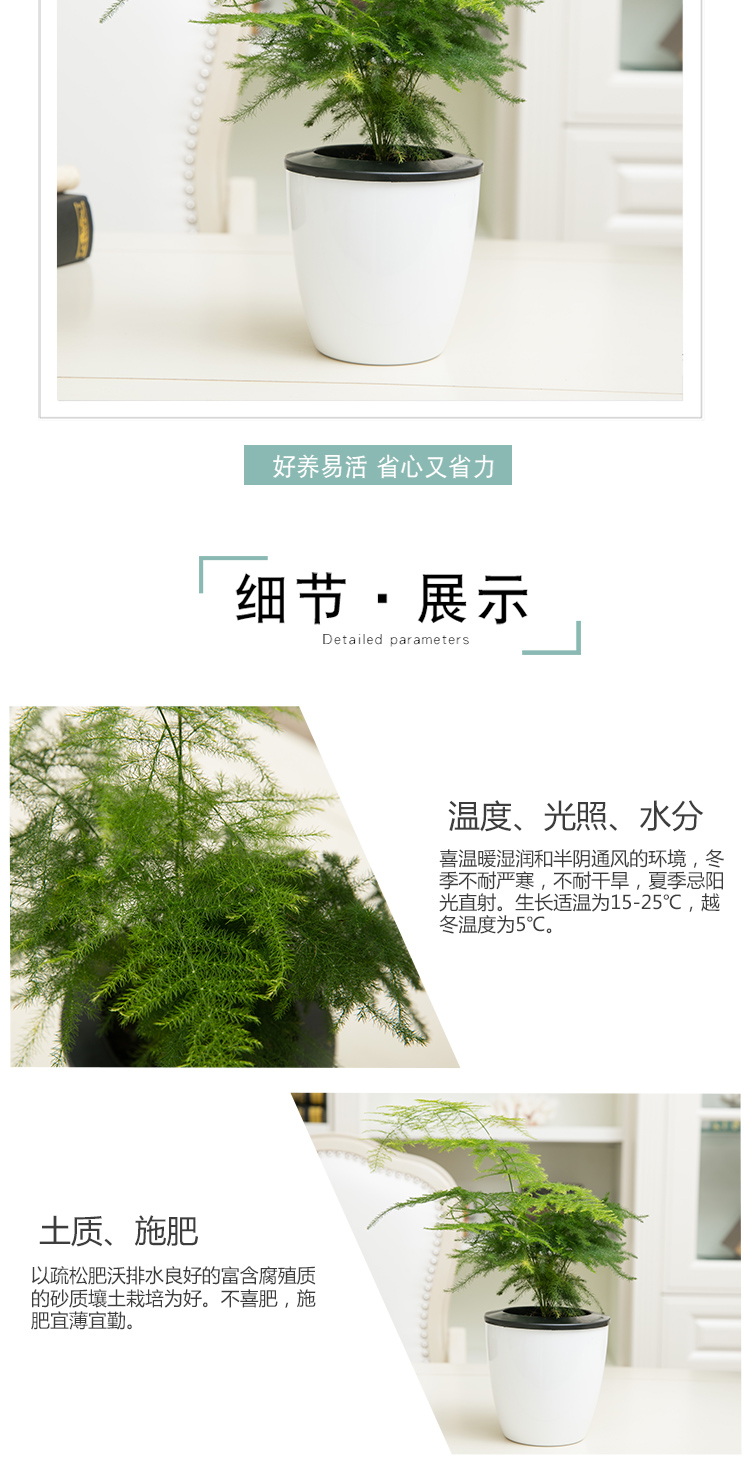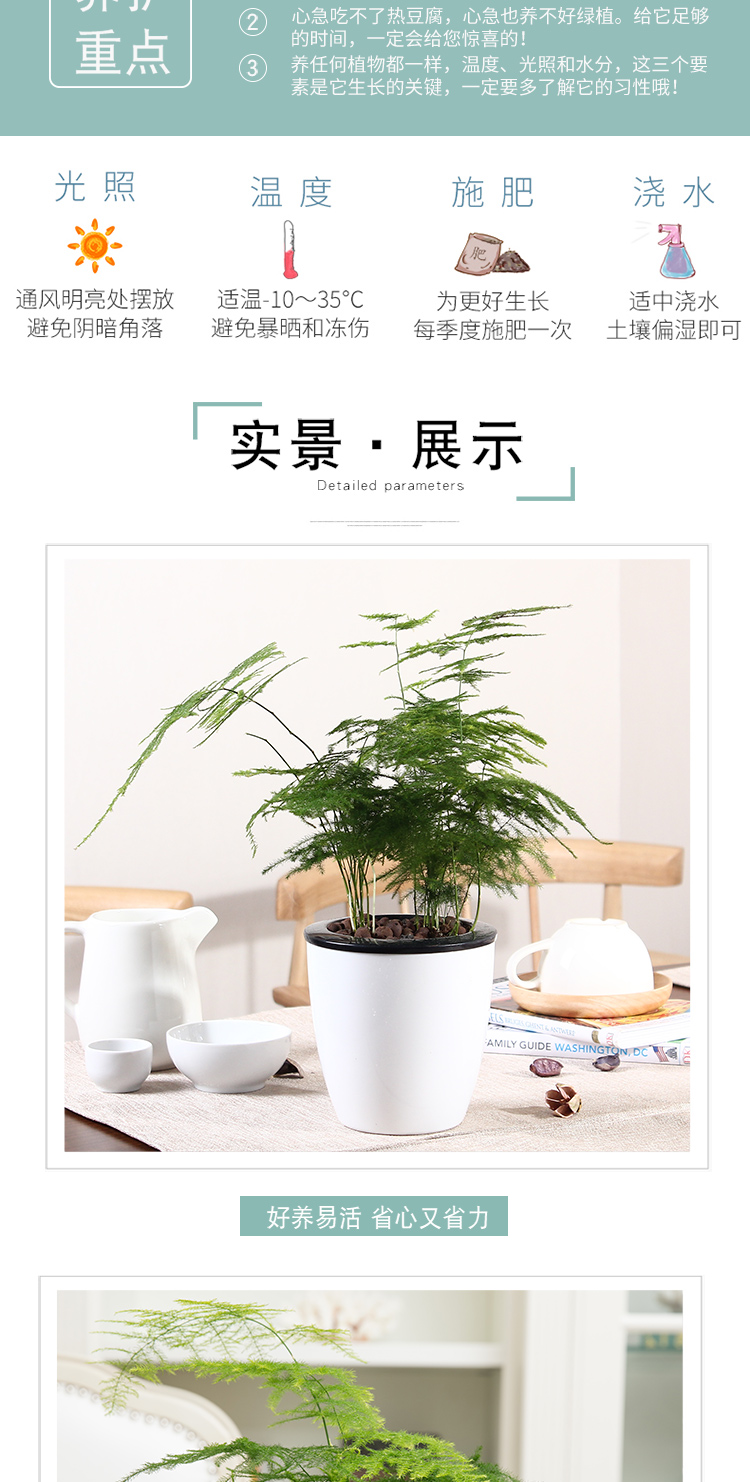 是否含花盆:带盆栽好;适用空间:庭院,阳台,客厅,办公桌,卧室,书房;植物品种:文竹;植物类别:观叶植物;包装清单:文竹*1,花盆*1,包装箱*1;