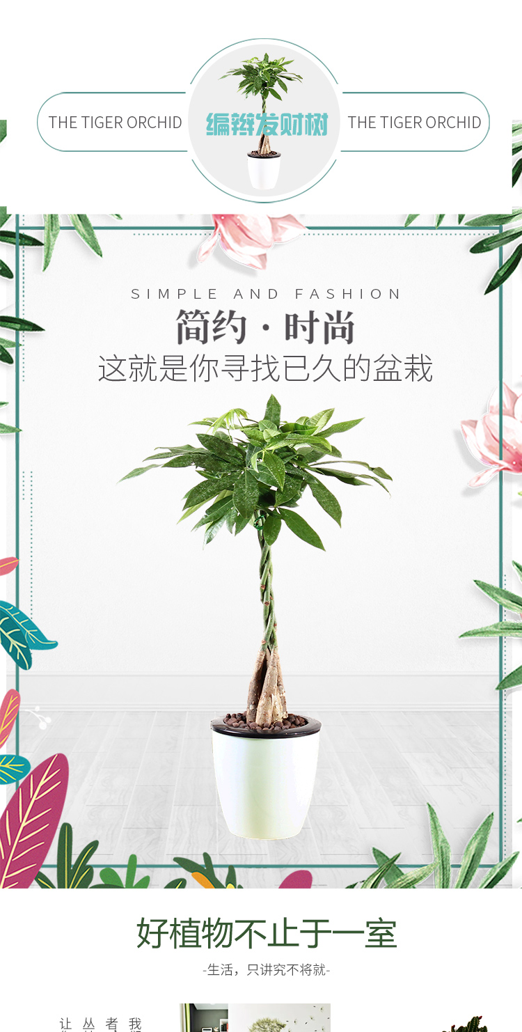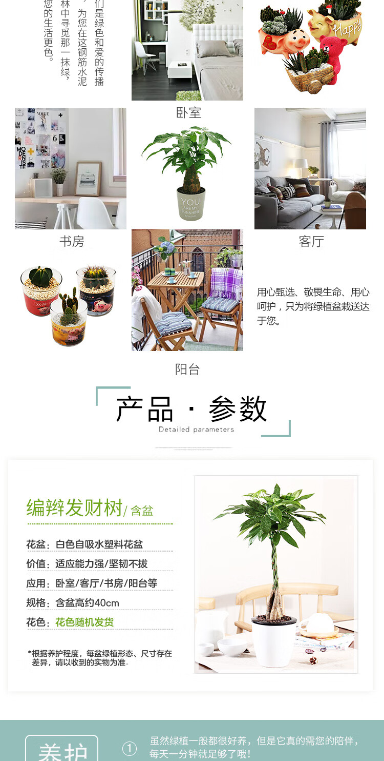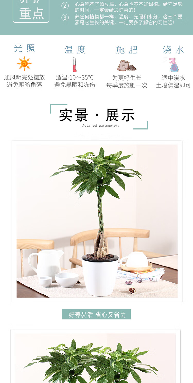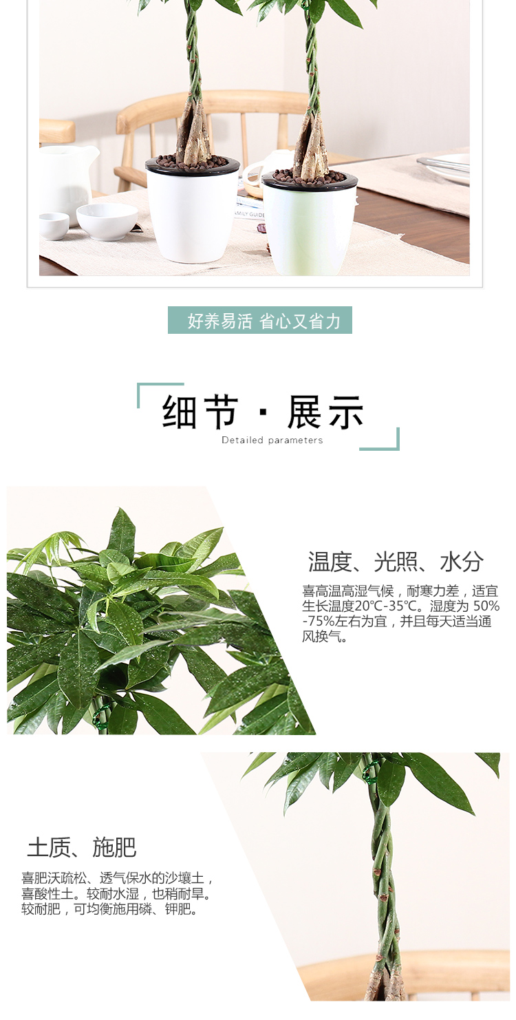 是否含花盆:带盆栽好;适用空间:庭院,阳台,客厅,办公桌,卧室,书房;植物品种:发财树;植物类别:观叶植物;包装清单:编辫发财树*1,花盆*1,包装箱*1;