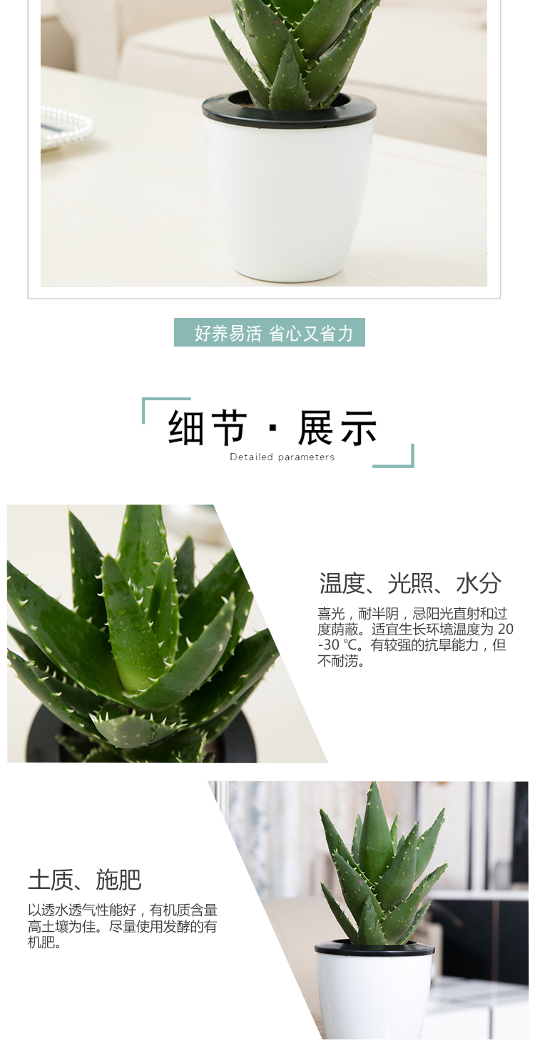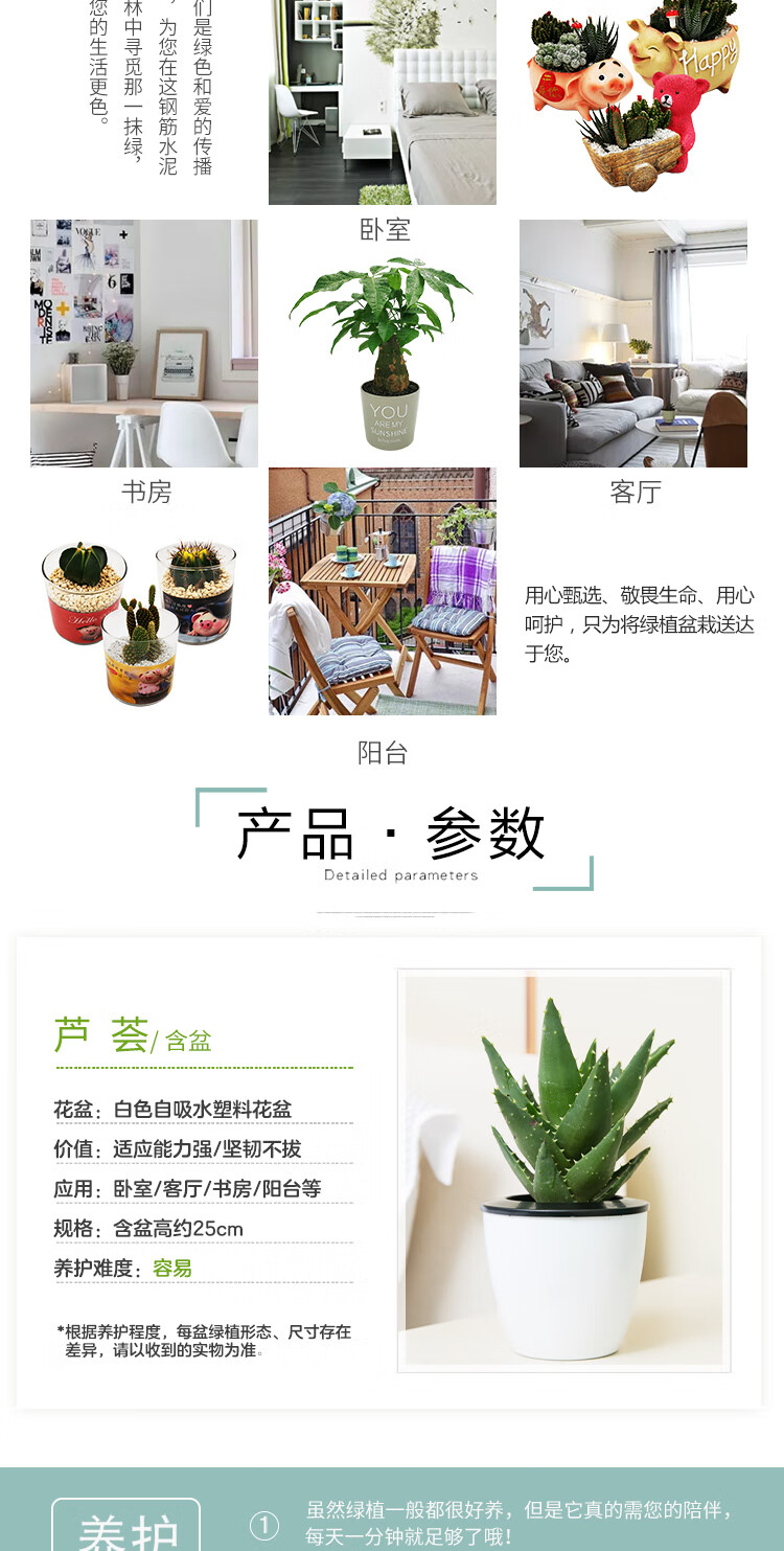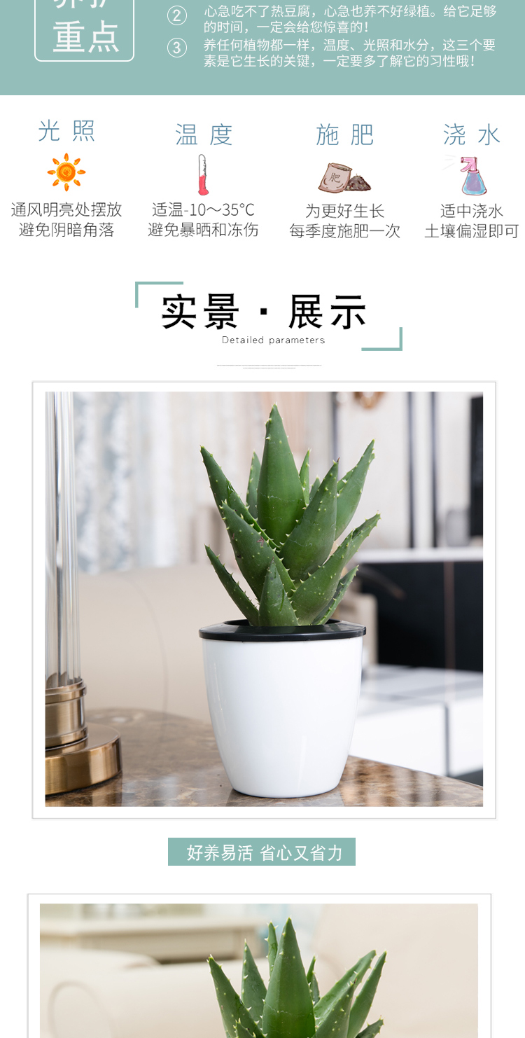 是否含花盆:带盆栽好;适用空间:庭院,阳台,客厅,办公桌,卧室,书房;植物品种:芦荟;植物类别:观叶植物;包装清单:小芦荟*1,花盆*1,包装箱*1;