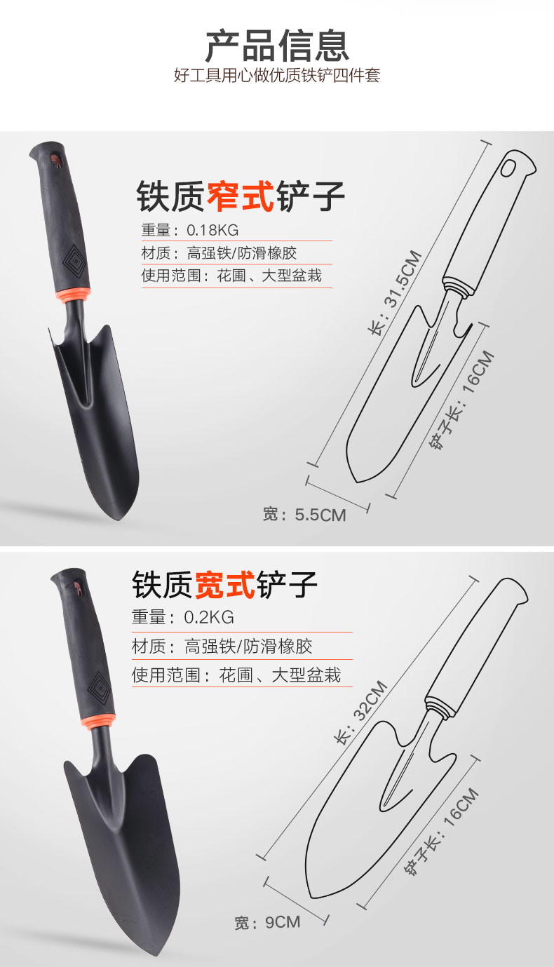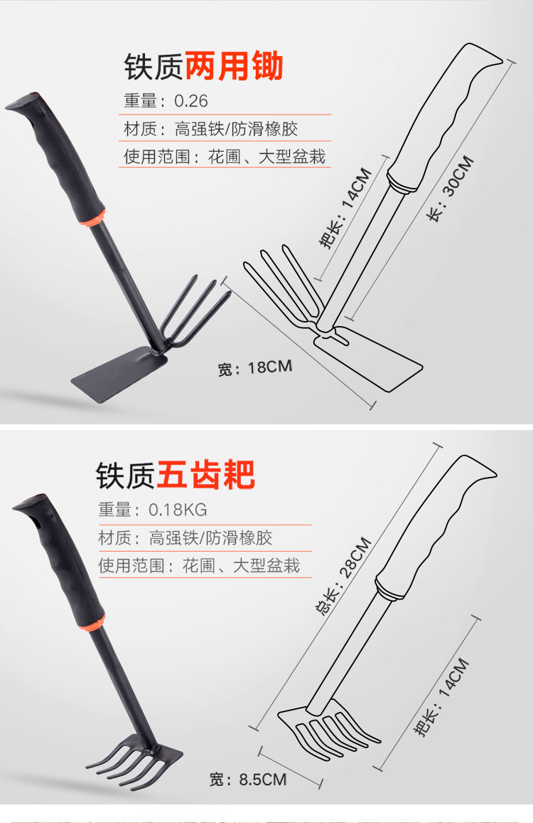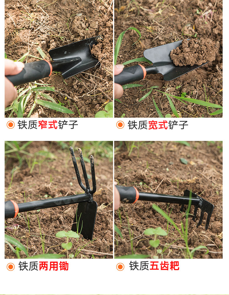分类:铲/耙/锹/锄;品牌:农宝;包装清单:两用锄头X1 五齿耙X1 宽铲X1 窄铲X1;