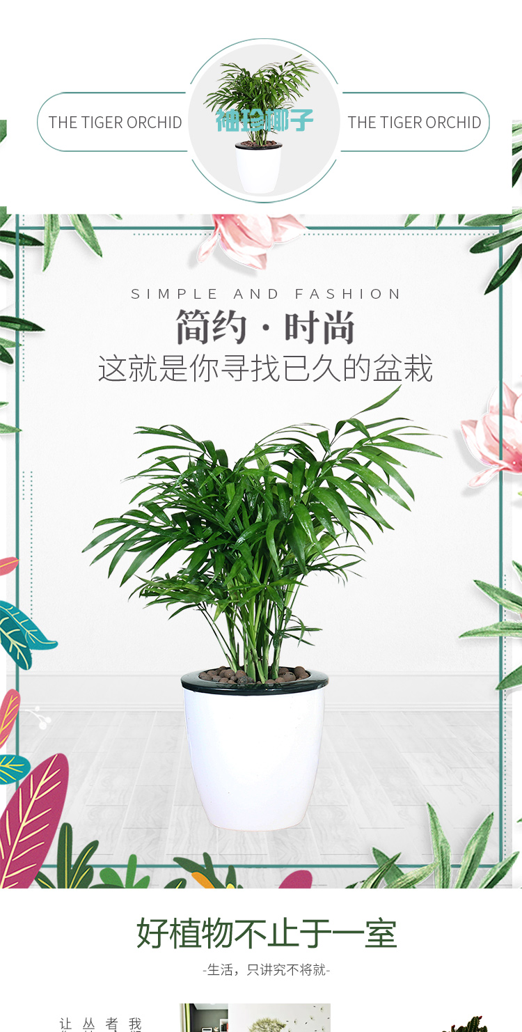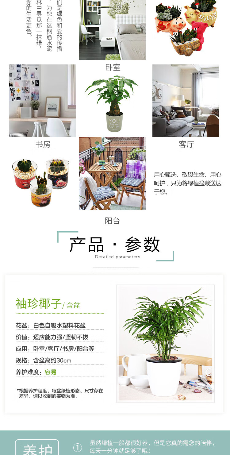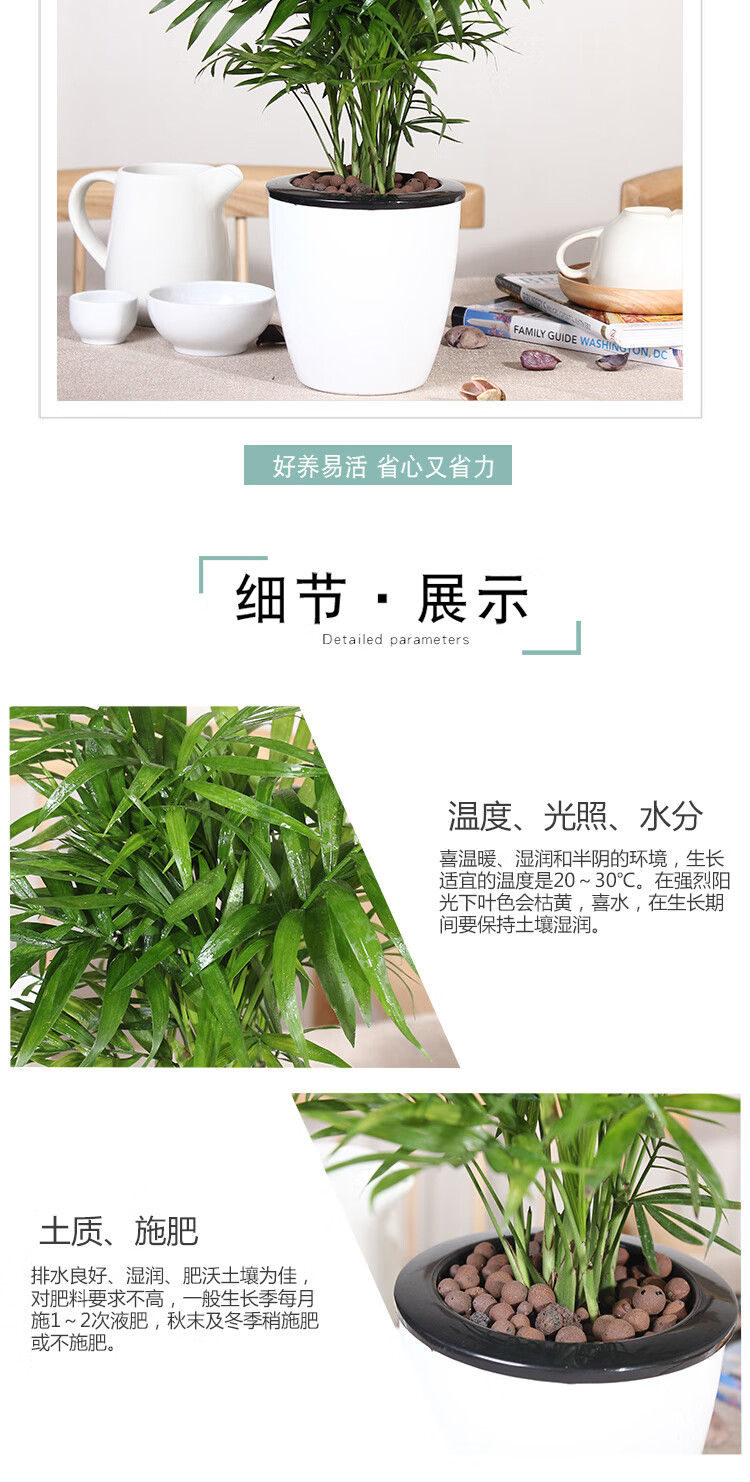 是否含花盆:带盆栽好;适用空间:庭院,阳台,客厅,办公桌,卧室,书房;植物品种:袖珍椰子;植物类别:观叶植物;包装清单:袖珍椰子*1,花盆*1,包装箱*1;