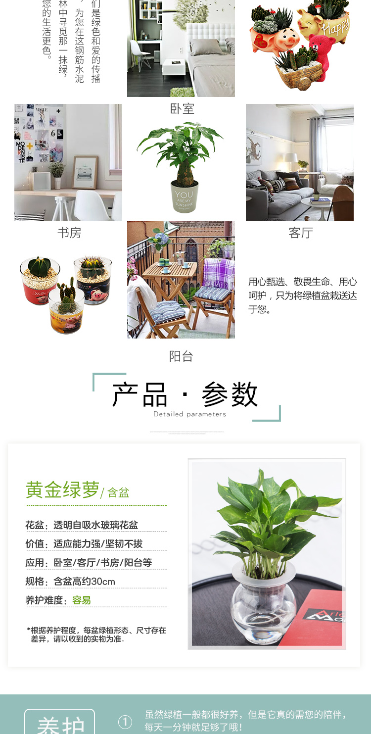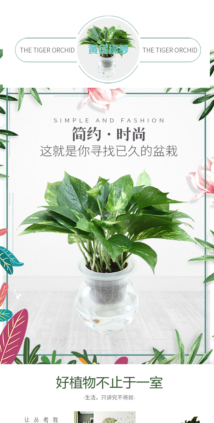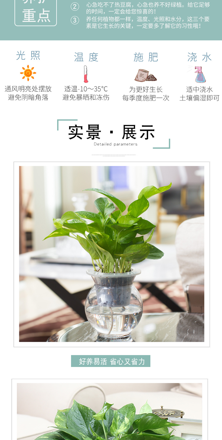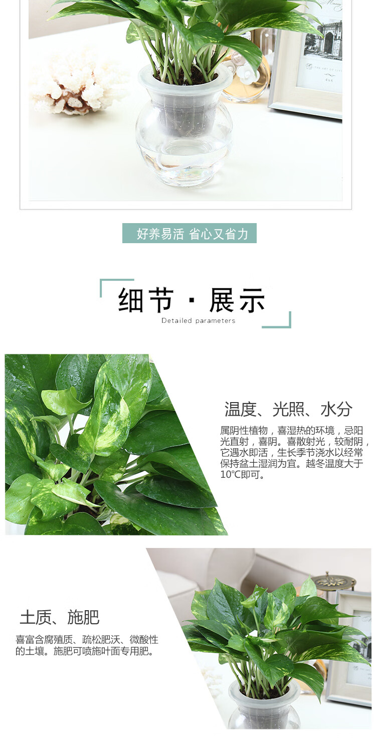 是否含花盆:带盆栽好;适用空间:庭院,阳台,客厅,办公桌,卧室,书房;植物品种:绿萝;植物类别:观叶植物;包装清单:水培系列—黄金绿萝*1,花盆*1,包装箱*1;