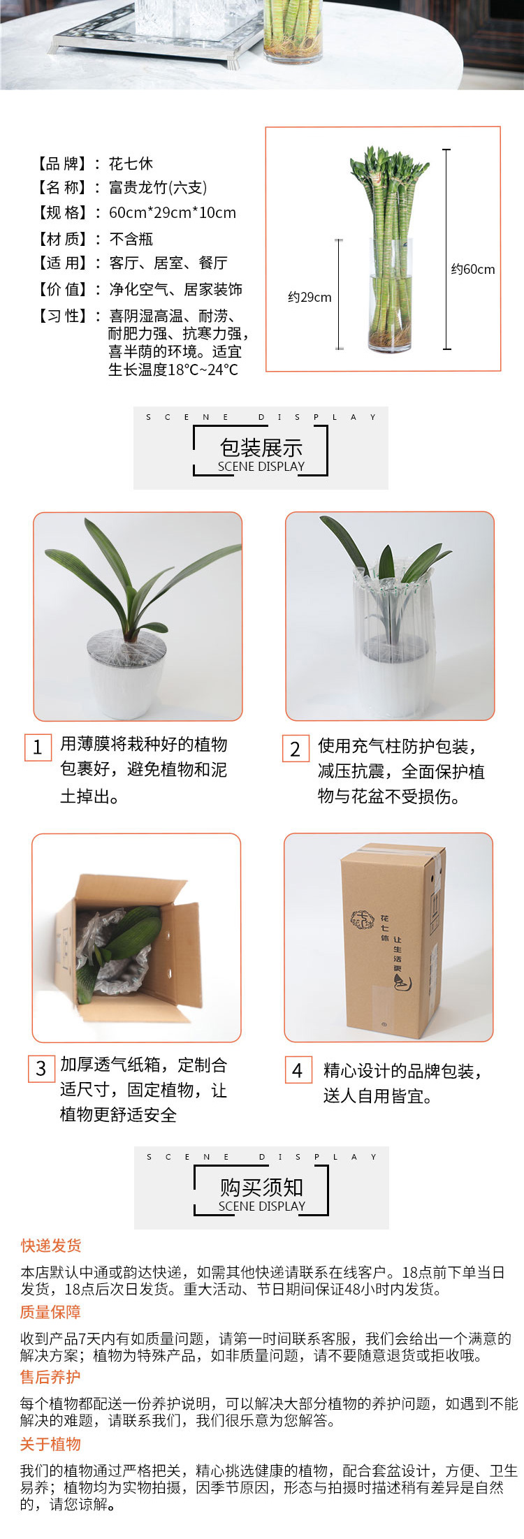 是否含花盆:不含盆;适用空间:庭院,阳台,客厅,办公桌,卧室,书房;包装清单:富贵龙竹六支,包装箱*1;