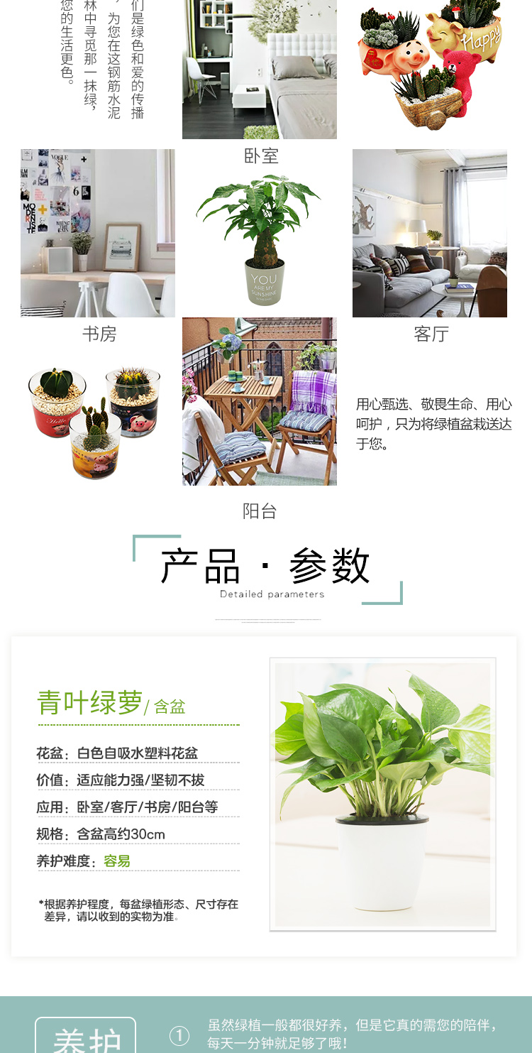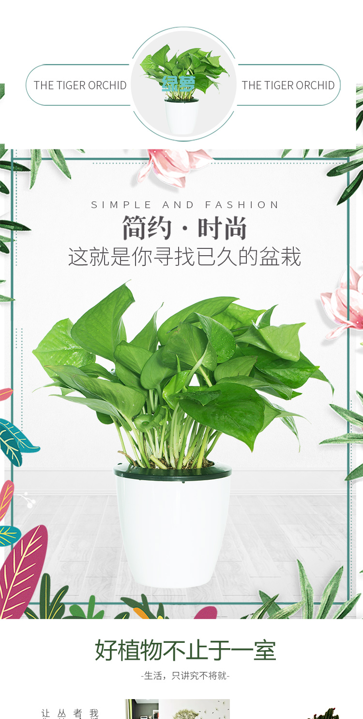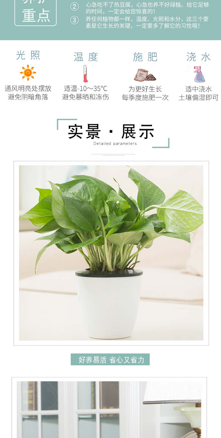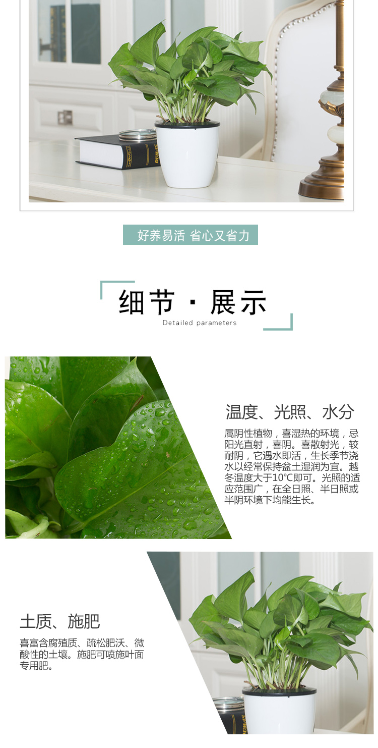 是否含花盆:带盆栽好;适用空间:庭院,阳台,客厅,办公桌,卧室,书房;植物品种:绿萝;植物类别:观叶植物;包装清单:青叶绿萝*1,花盆*1,包装箱*1;