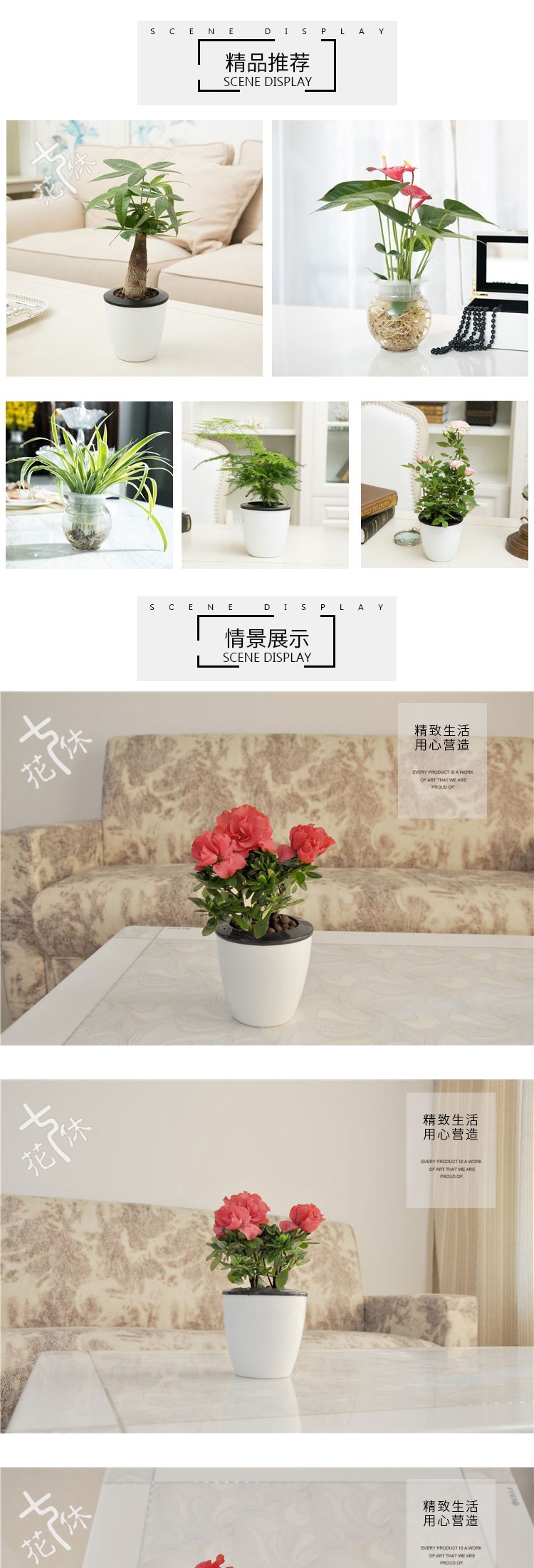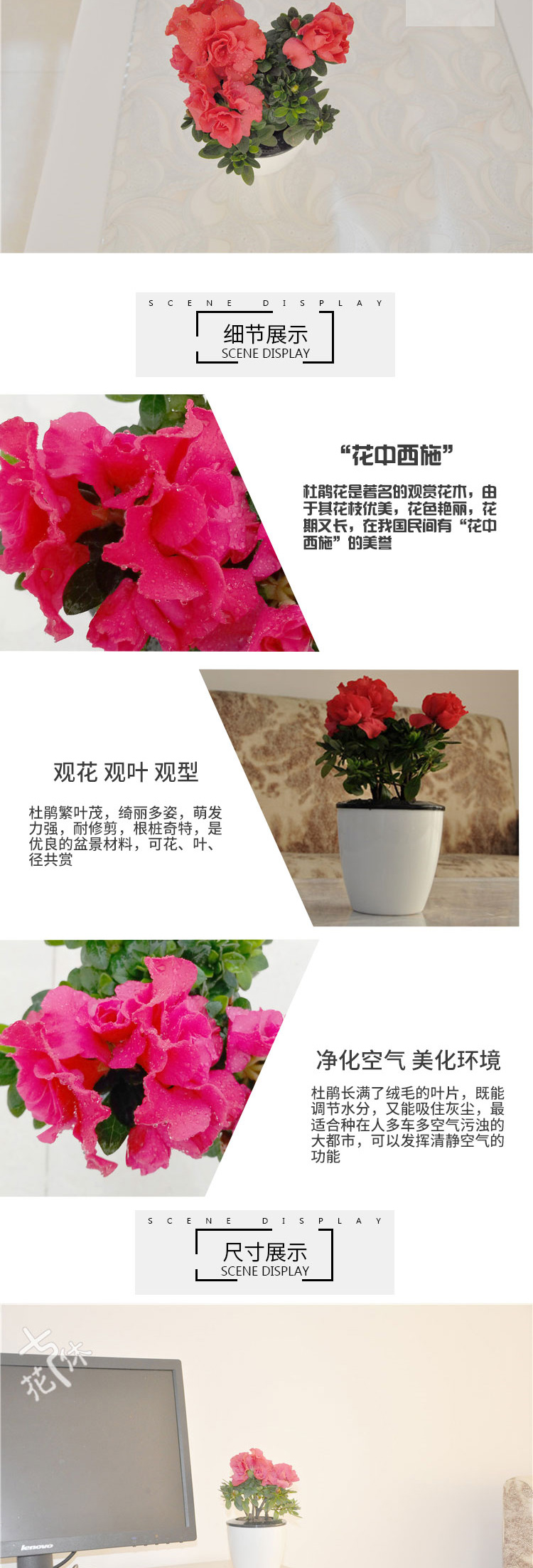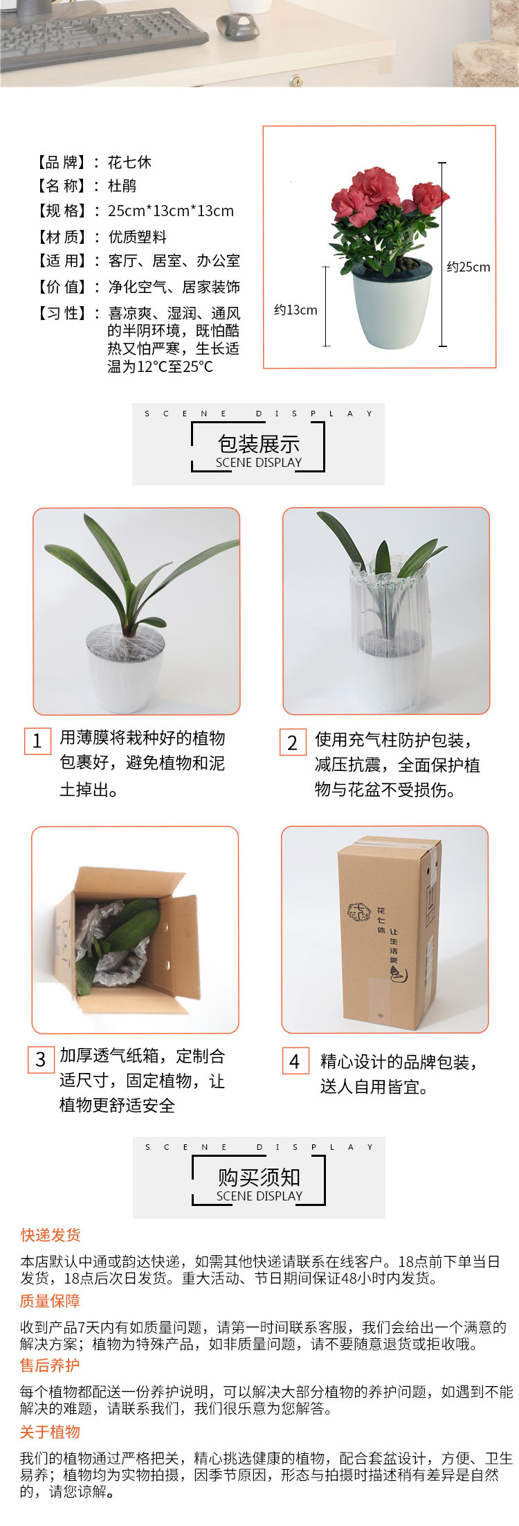 是否含花盆:含盆;适用空间:庭院,阳台,客厅,办公桌,卧室,书房;包装清单:杜鹃×1、白色自吸水塑料花盆×1、包装箱×1;
