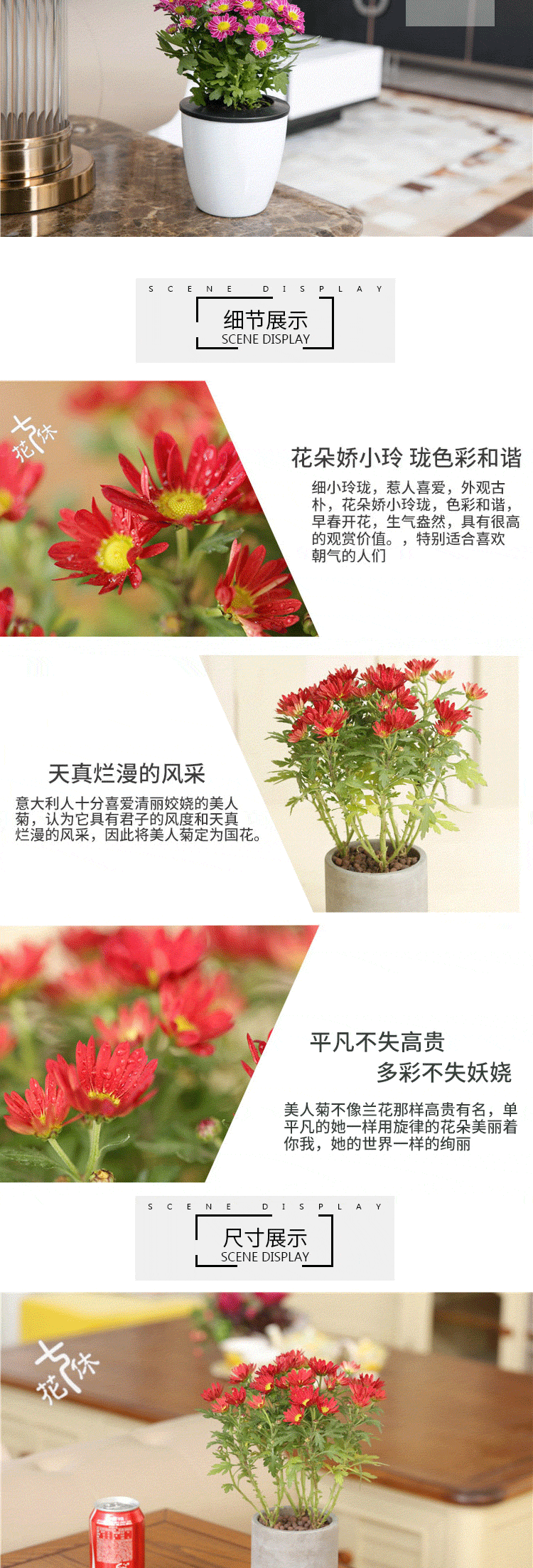 开花季节:长花期;是否含花盆:带盆栽好;适用空间:庭院,阳台,客厅,办公桌,卧室,书房;颜色:红色、白色、黄色、紫色;包装清单:美人菊*1,花盆*1,包装箱*1;