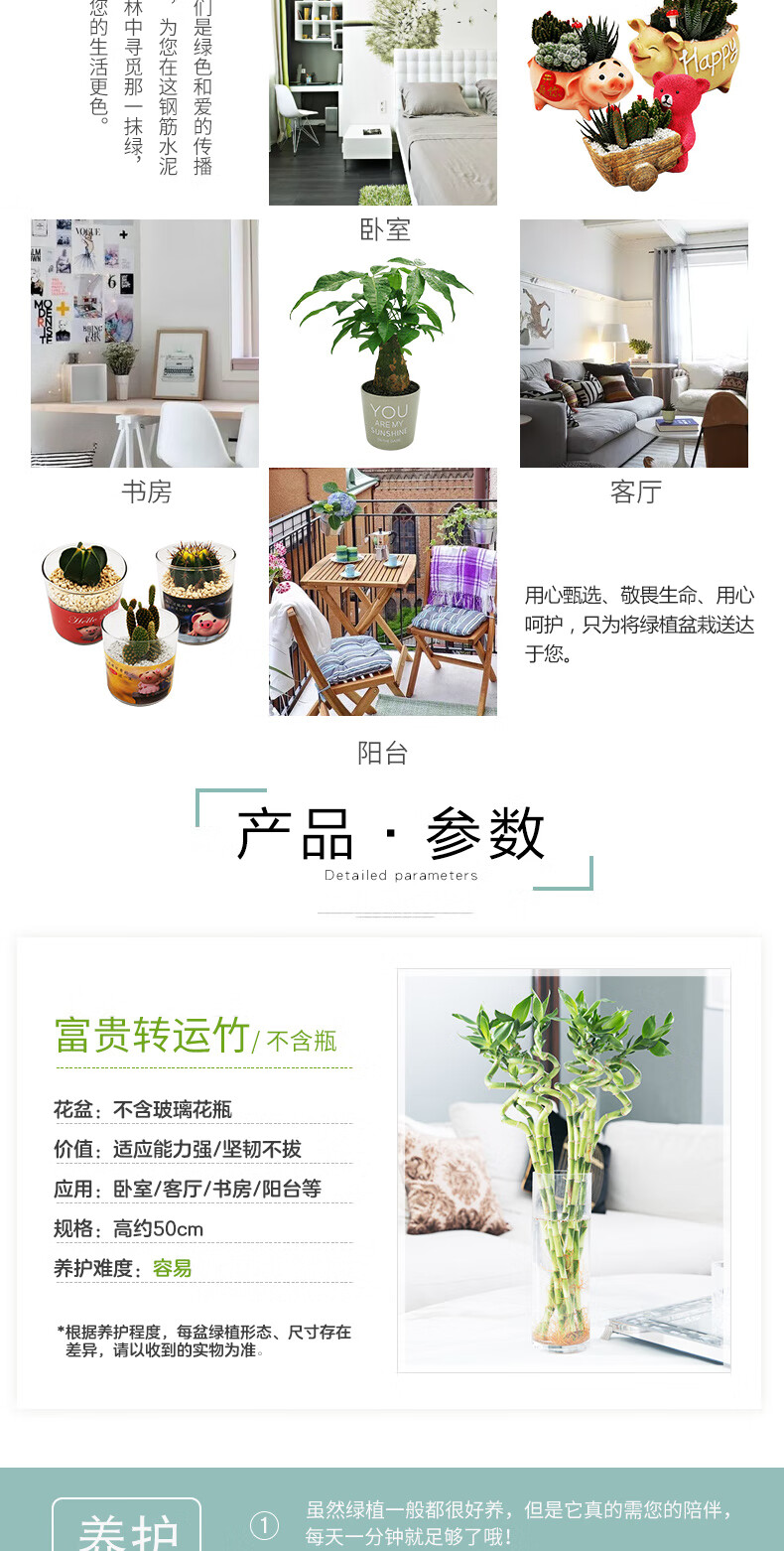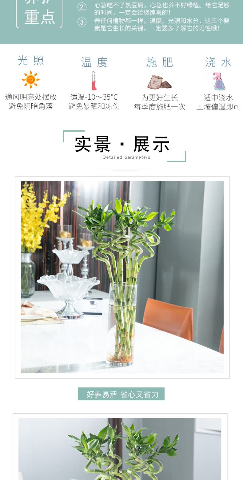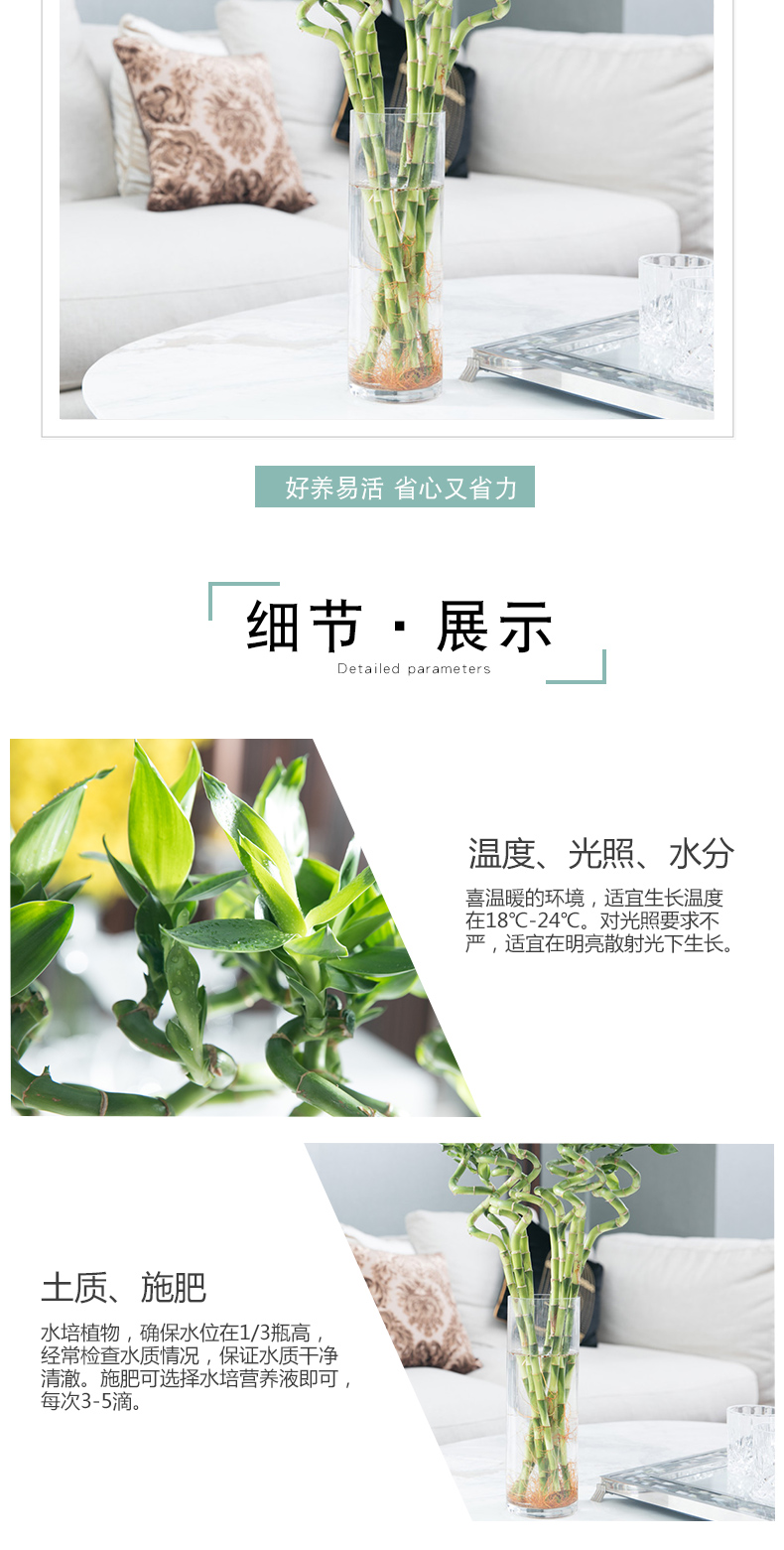 是否含花盆:不含盆;适用空间:庭院,阳台,客厅,办公桌,卧室,书房;植物品种:富贵竹;植物类别:水培植物;包装清单:富贵转运竹十支,包装箱*1;