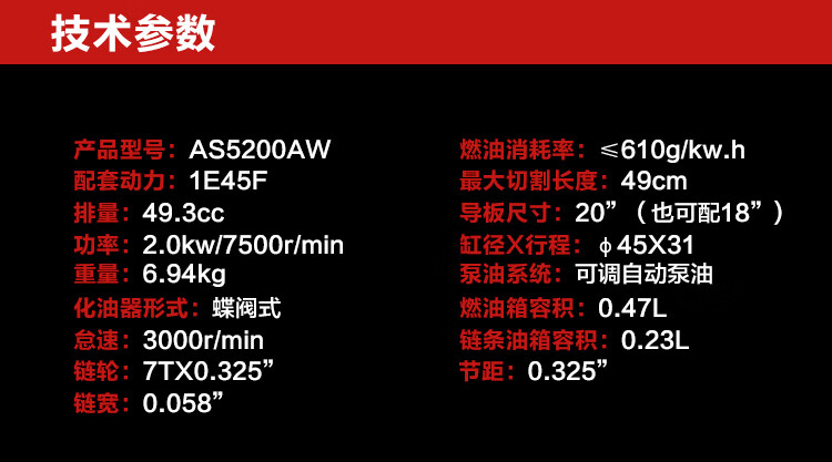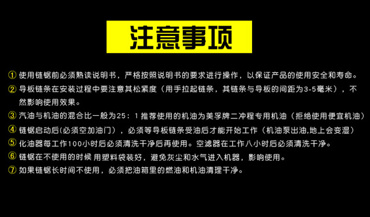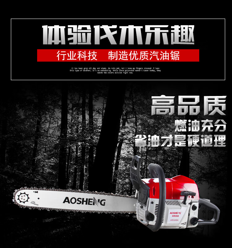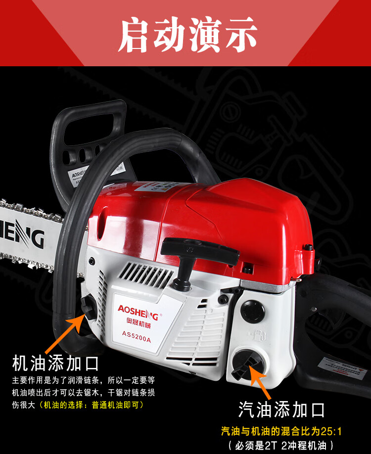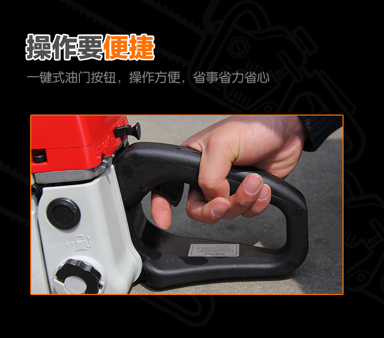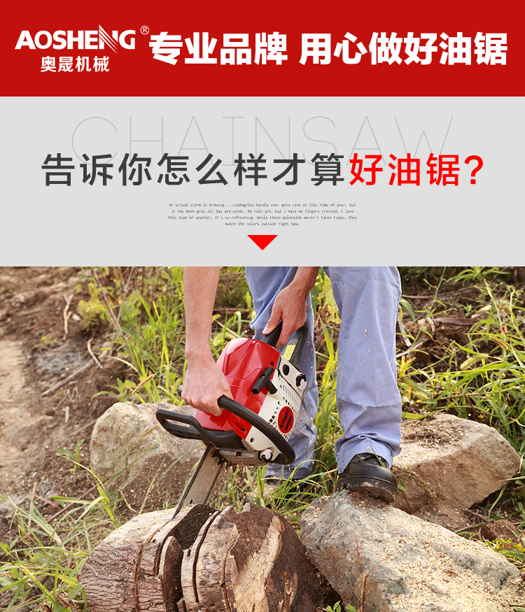 机械类型:油锯;动力类型:二冲程;适用对象:其它,路旁树篱,树木;包装清单:主机*1,导板×1,导板套×1,链条×1,配比壶×1, 锉刀×1, 齿形板×1, 内六角圆柱头螺钉×2,弹簧垫×2,平垫×2, 一字套筒扳手×1, 内六角扳手×1,小一字螺丝刀×1,中文说明书×1,合格证×1,三包凭证×1;