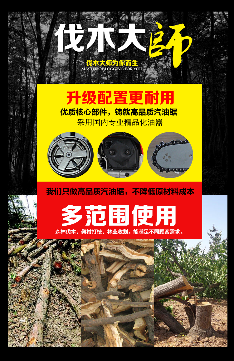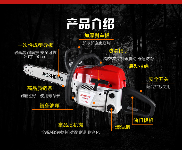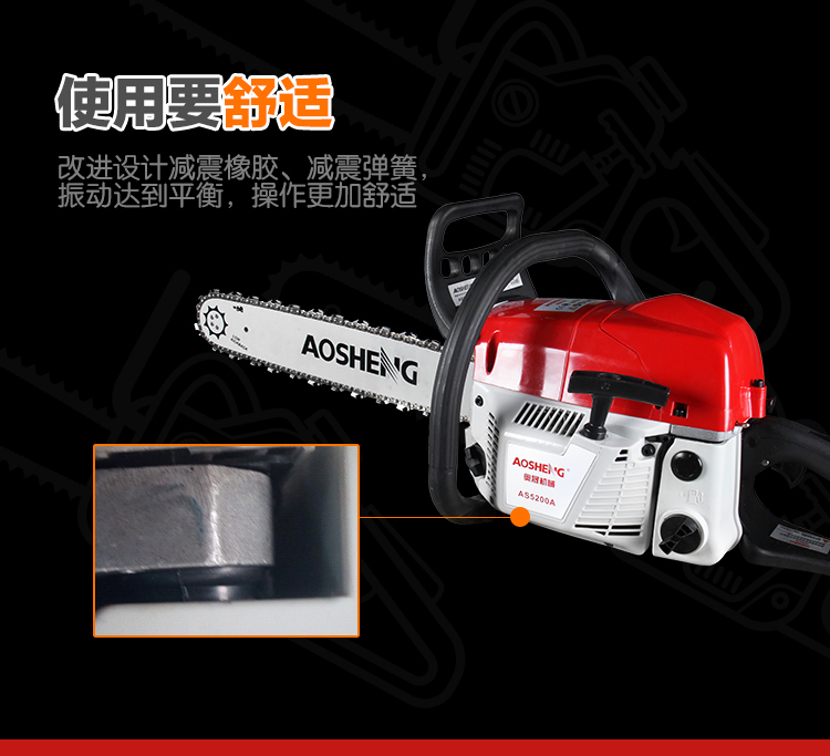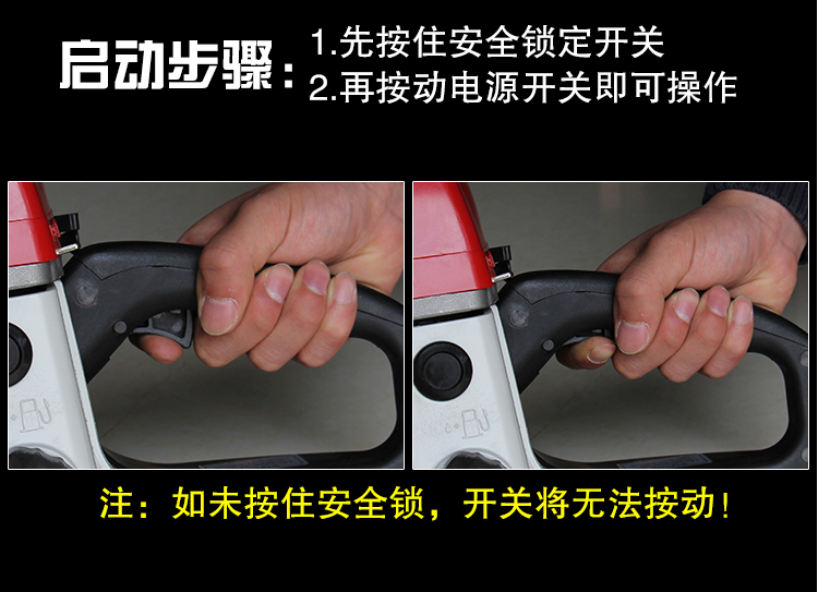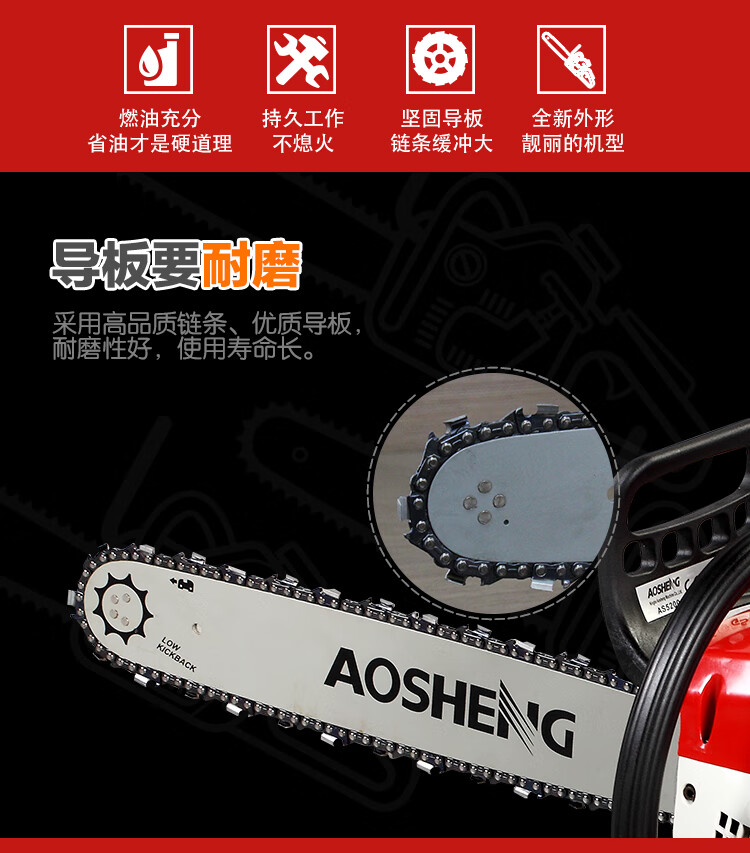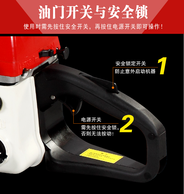 机械类型:油锯;动力类型:二冲程;适用对象:其它,路旁树篱,树木;包装清单:主机*1,导板×1,导板套×1,链条×1,配比壶×1, 锉刀×1, 齿形板×1, 内六角圆柱头螺钉×2,弹簧垫×2,平垫×2, 一字套筒扳手×1, 内六角扳手×1,小一字螺丝刀×1,中文说明书×1,合格证×1,三包凭证×1;