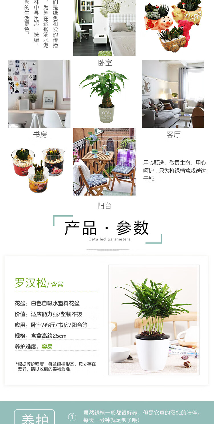 是否含花盆:带盆栽好;适用空间:庭院,阳台,客厅,办公桌,卧室,书房;植物品种:罗汉松;植物类别:观叶植物;包装清单:罗汉松*1,花盆*1,包装箱*1;