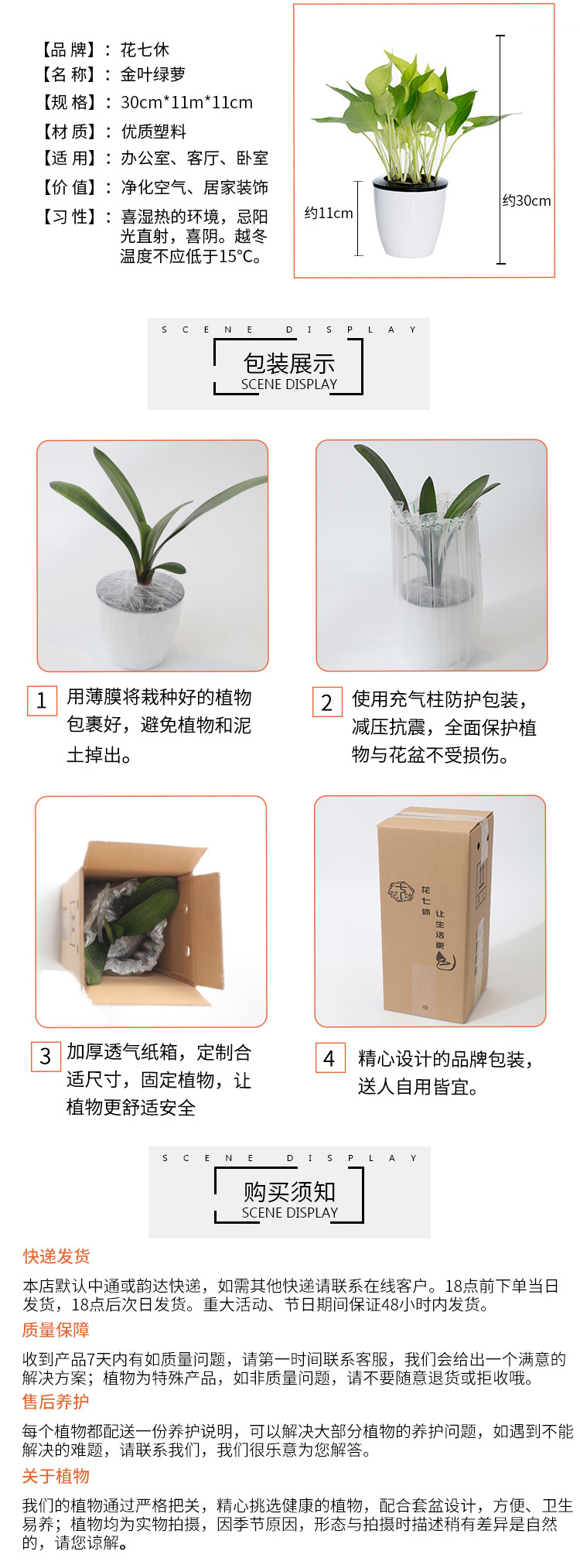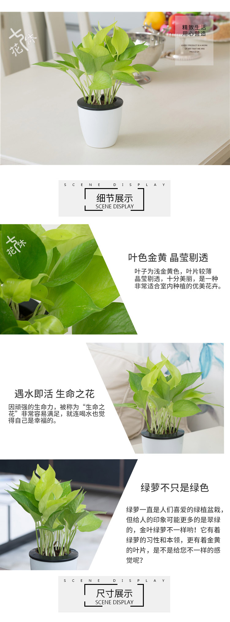 是否含花盆:带盆栽好;适用空间:庭院,阳台,客厅,办公桌,卧室,书房;包装清单:金叶绿萝*1,花盆*1,包装箱*1;