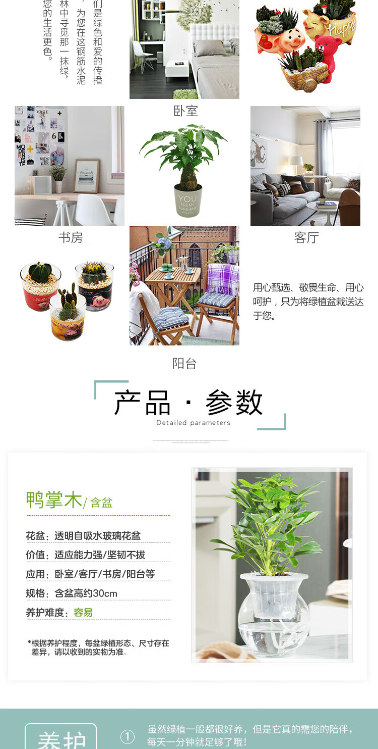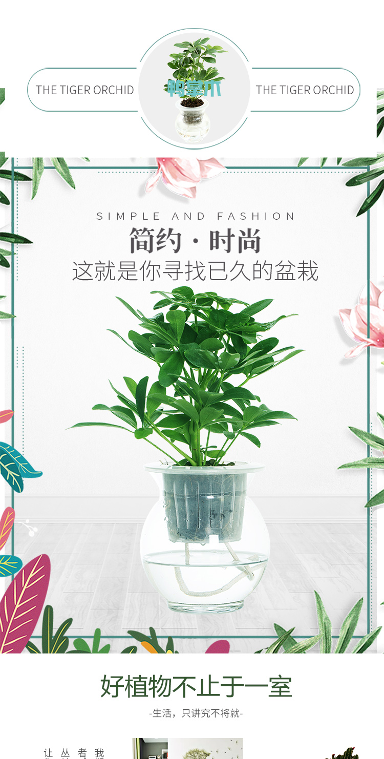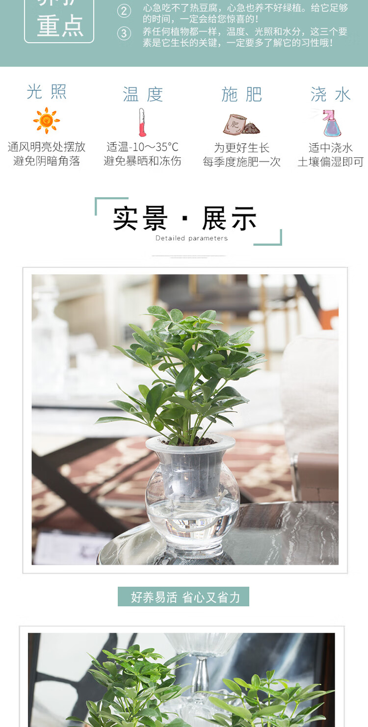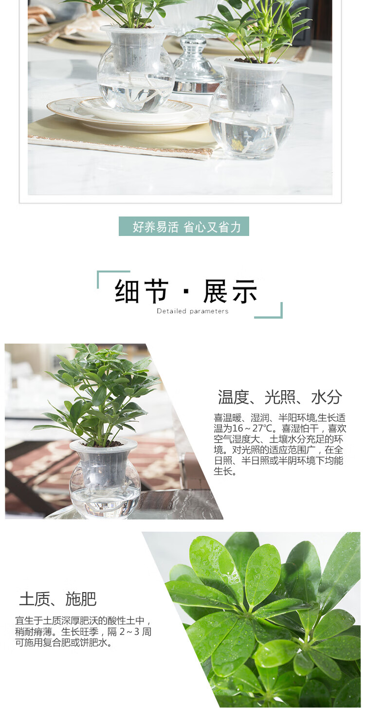 是否含花盆:带盆栽好;适用空间:庭院,阳台,客厅,办公桌,卧室,书房;植物品种:鸭脚木;植物类别:观叶植物;包装清单:水培系列—鸭掌木*1,花盆*1,包装箱*1;