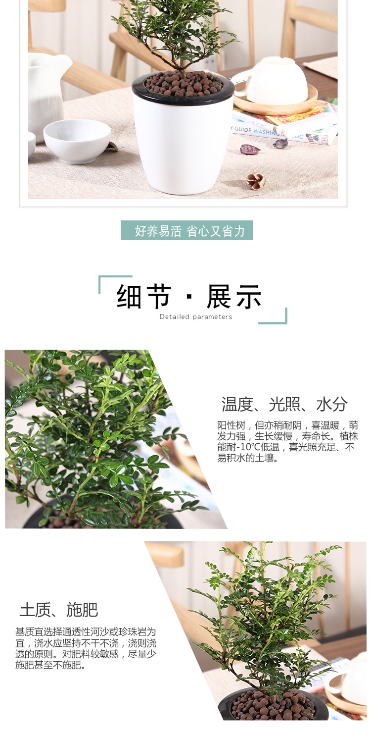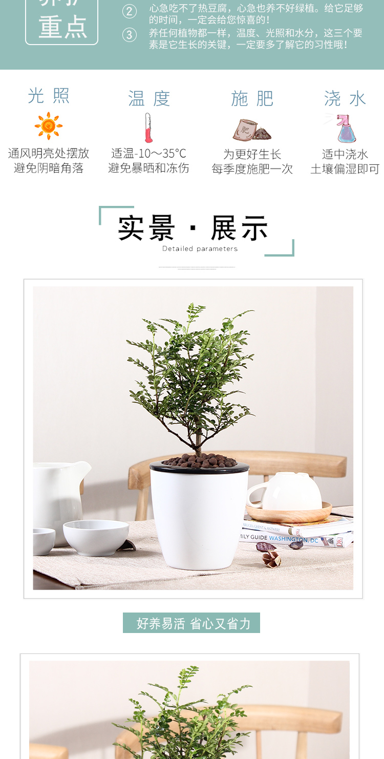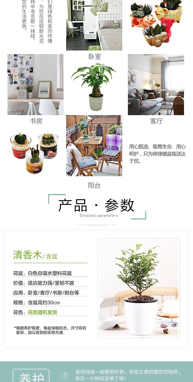 是否含花盆:带盆栽好;适用空间:庭院,阳台,客厅,办公桌,卧室,书房;植物品种:清香木;植物类别:观叶植物;包装清单:清香木×1、白色自吸水塑料花盆×1、包装箱×1;