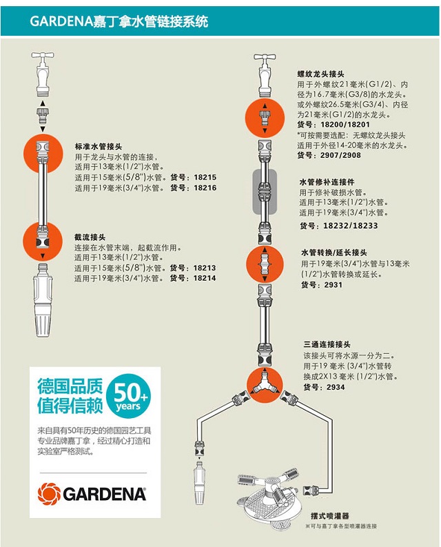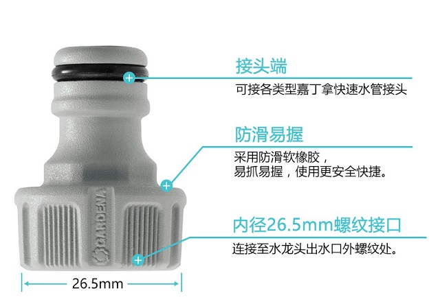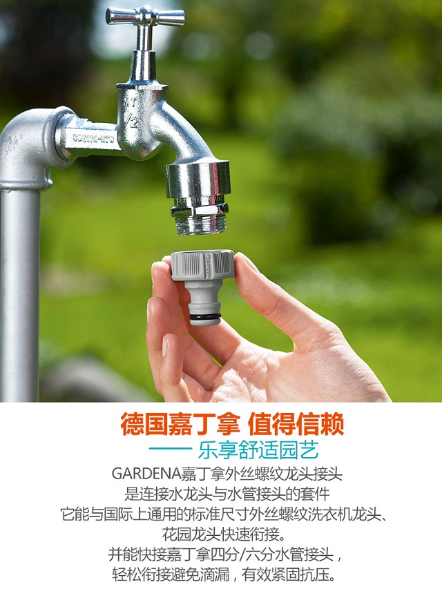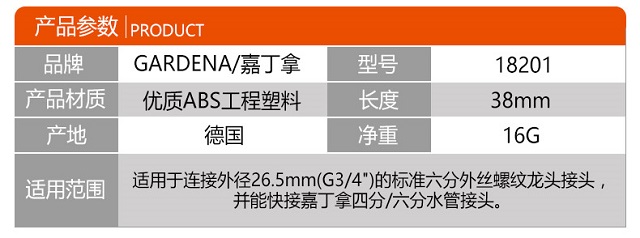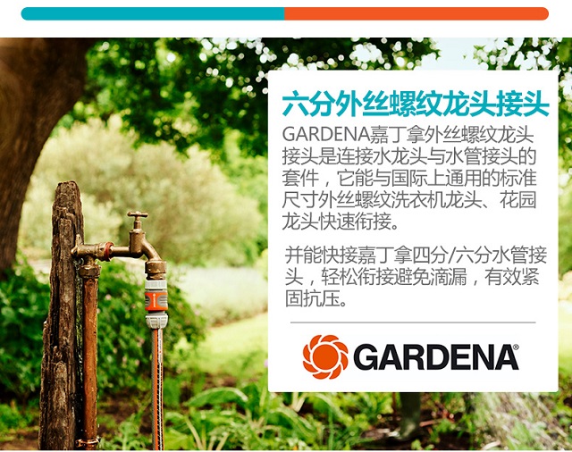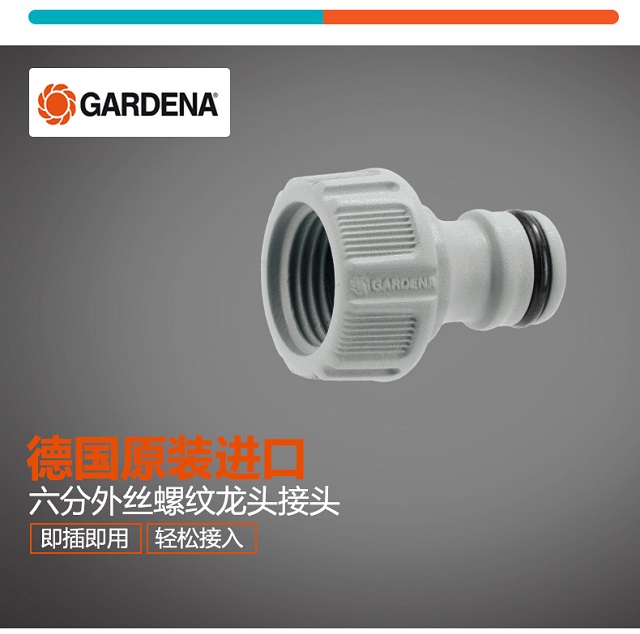 材质:塑料;分类:接头;品牌:嘉丁拿(GARDENA);包装清单:六分外丝螺纹接头*1;