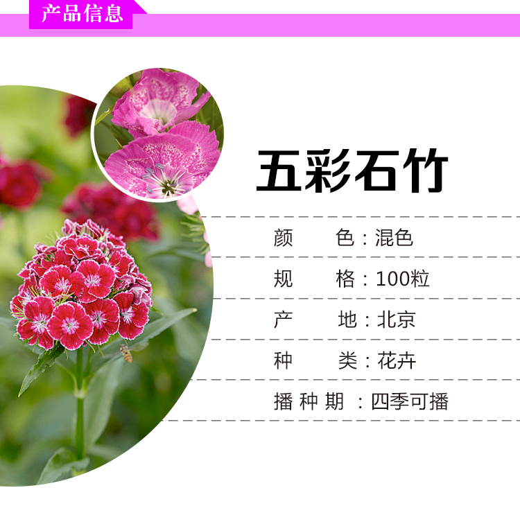 种类:草花;适种区域:东北,华北,华中,华东,华南,西南,西北;适播季节:春,夏,秋,冬;国别:国产;类别:常规种子;种子经营许可证编号:CD(京)农种经许字第(2014)第0025号;包衣:无包衣;生产年份(年):2019年;芽率(%):80;水分(%):8%;净度(%):98%;纯度(%):95%;包装清单:一袋种子X1;